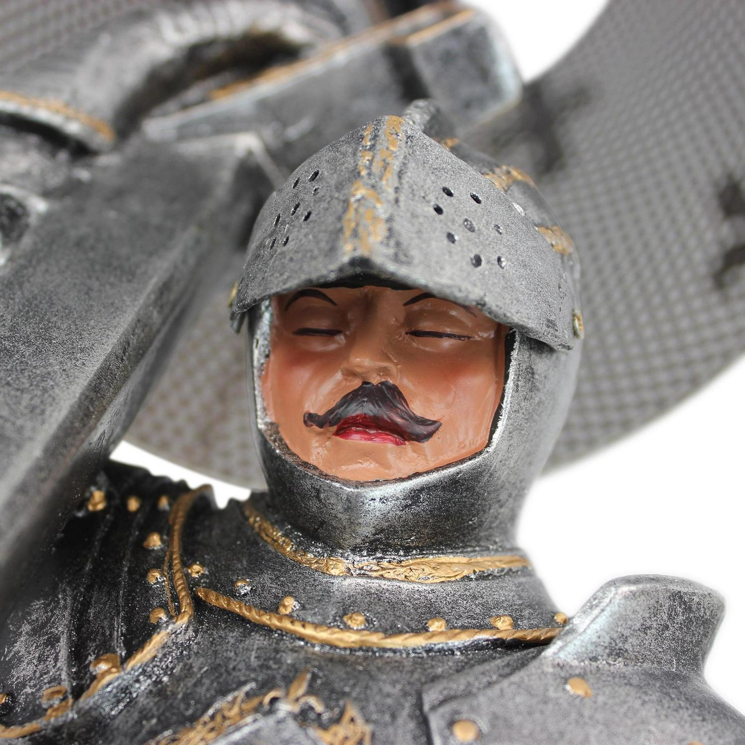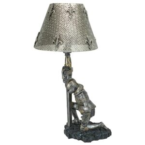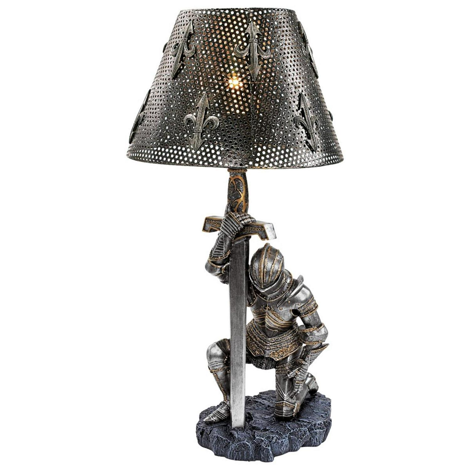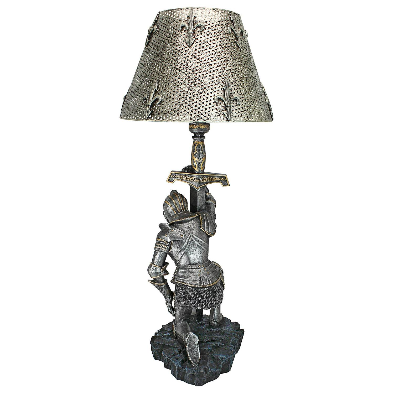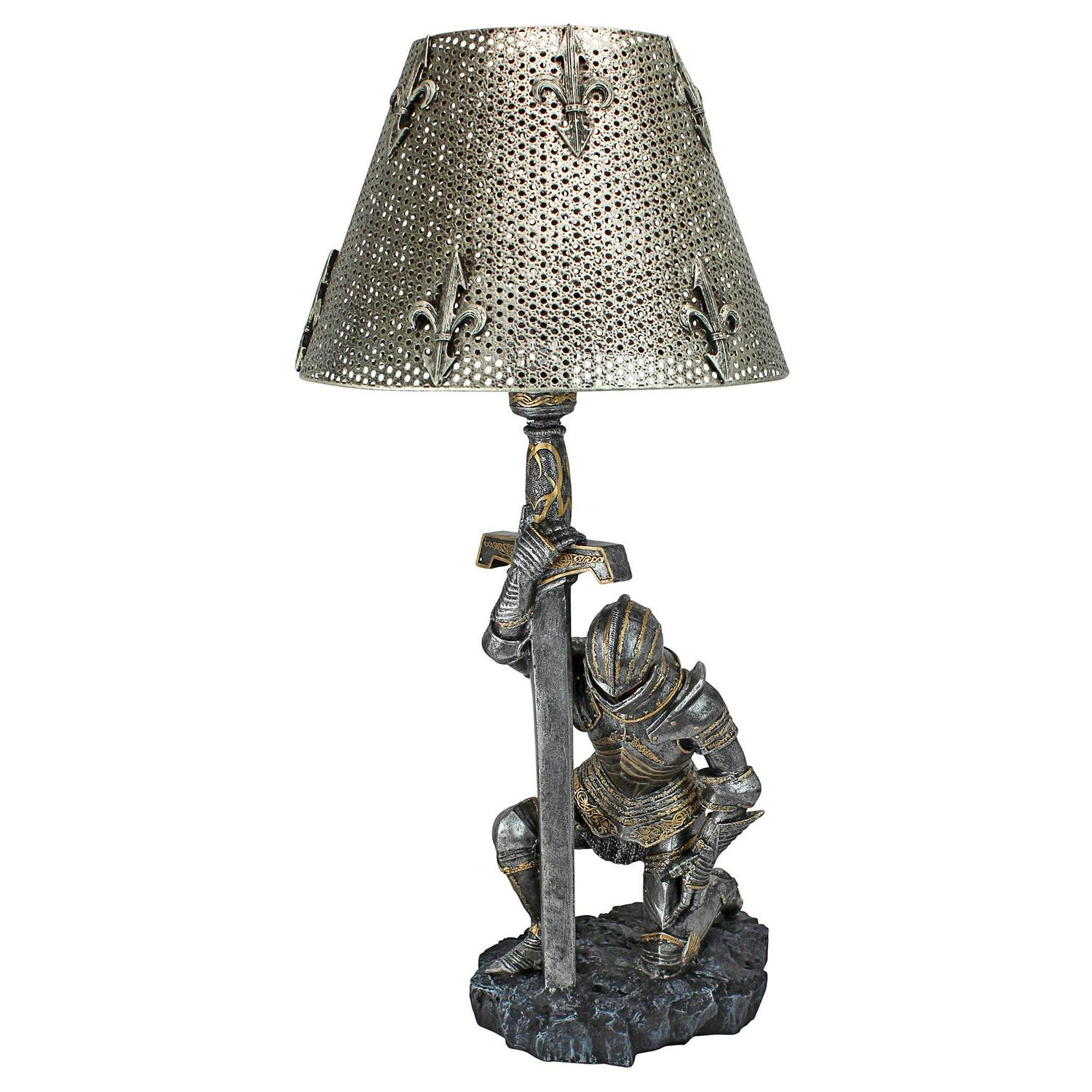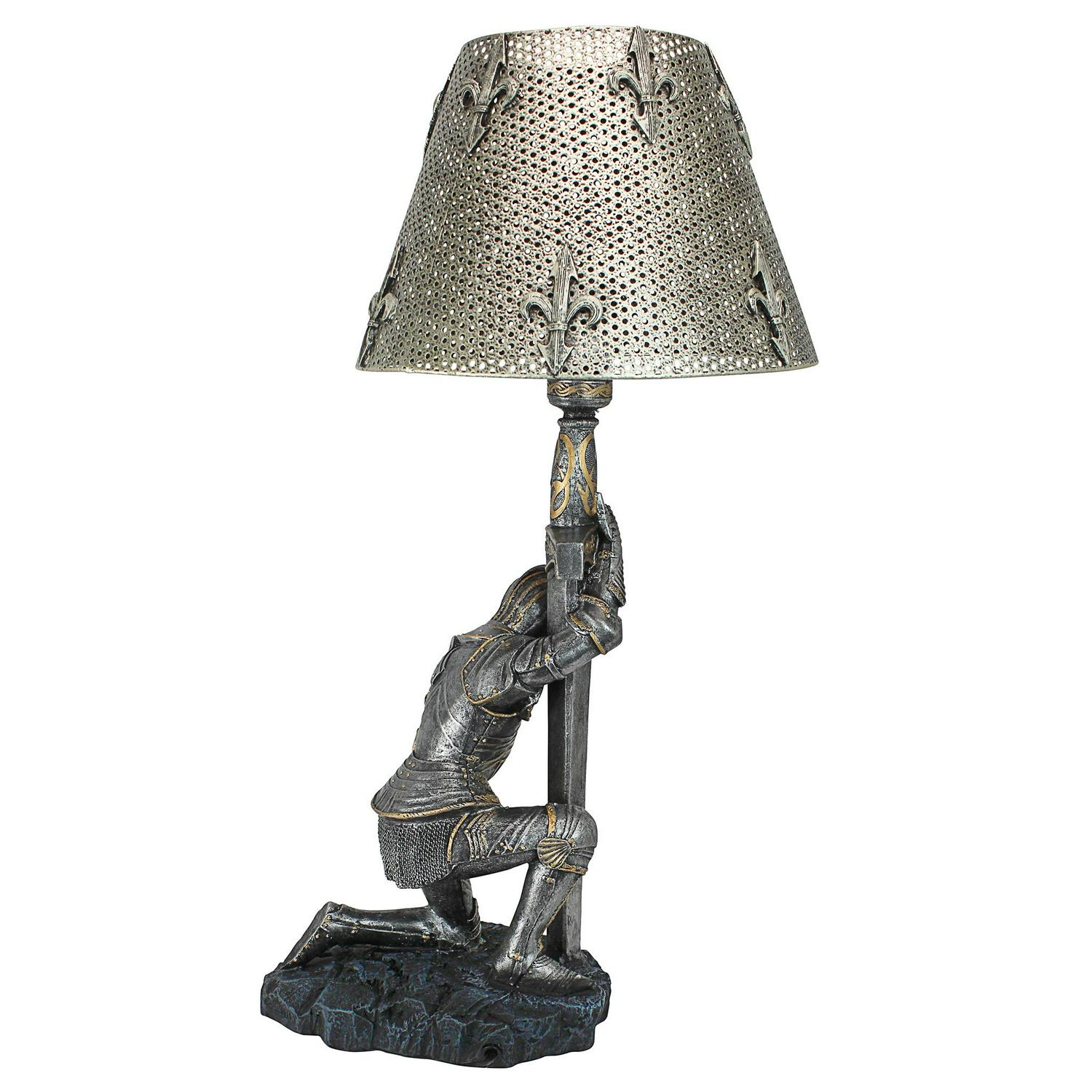 – Giving thanks for survival after another battle, a weary warrior in full armor bows on bended knee beneath a pierced metal shade embellished with fleur-de-lis. This incredible, two-tone sculptural lamp is a Toscano catalog exclusive cast in quality designer resin that adds historic sophistication to any decor. Switch on cord; accepts your 40-watt bulb. Each approx. 10.5″dia.x22″H. 6 lbs.