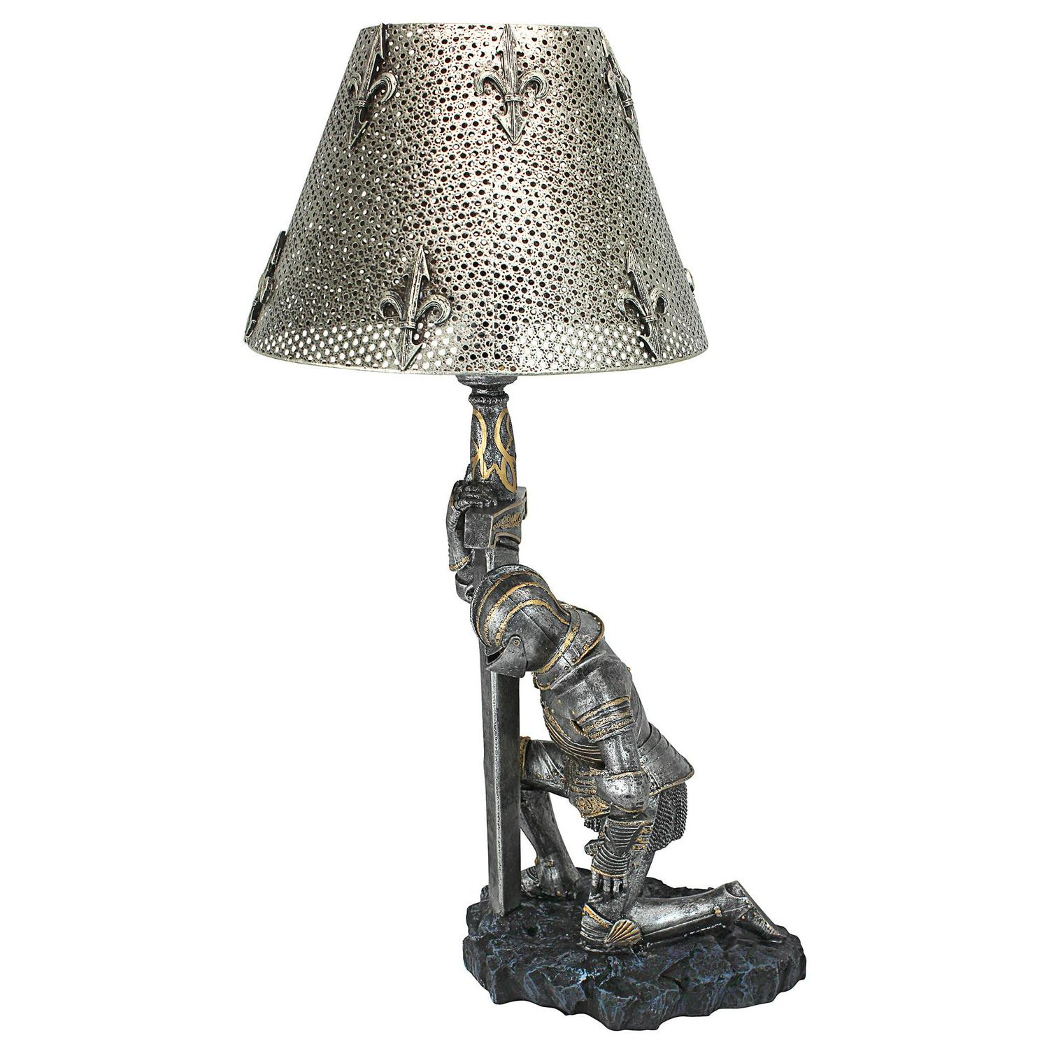 Exclusive to the Design Toscano brand and perfect for your home or garden Convenient switch on cord. Takes one 40 watt bulb or CFL/LED equivalent Giving thanks for survival after another battle, a weary warrior in full armor bows on bended knee beneath a pierced metal shade embellished with fleur-de-lis. This incredible, two-tone sculptural lamp is a Toscano catalog exclusive cast in quality designer resin that adds historic sophistication to any decor. Switch on cord; accepts your 40-watt bulb.