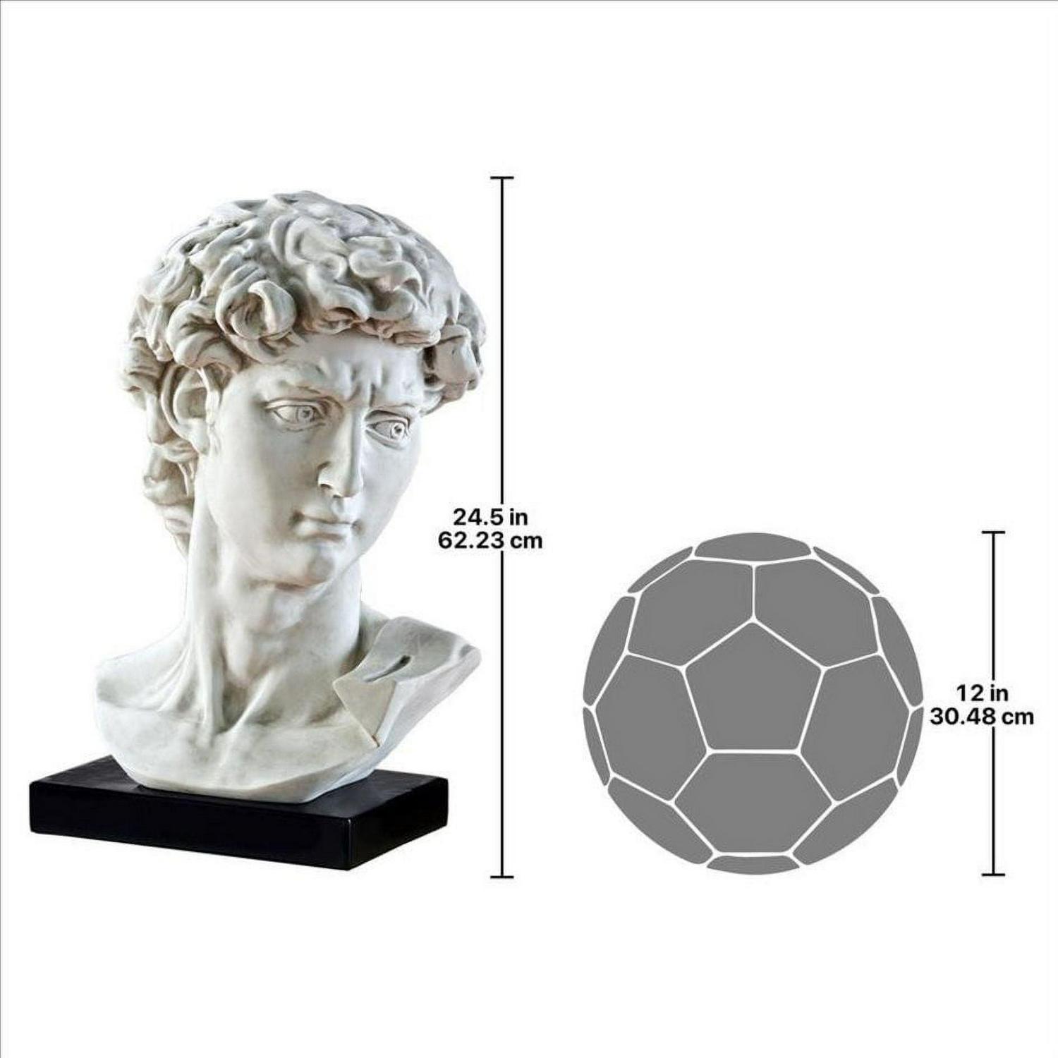– One of the best replica statues of David we’ve ever seen! This two-foot high classic sculpture bust replicates one of the world’s most recognizable works of art, and embodies an idealistic and naturalistic view of man. The 1504 High Renaissance masterpiece sculpture depicts the young shepherd whose faith in God allowed him to slay the giant Goliath. Upon completion of this classic statue Michelangelo proved to his contemporaries that he not only surpassed all Renaissance artists, but also the Greeks and Romans, by infusing formal beauty with powerful heroic courage and meaning. Cast in quality designer resin, this over two-foot-tall Design Toscano exclusive statue is gallery ready with a faux stone finish set atop an ebony museum mount. A wonderful balance of classic and contemporary accent decor piece! 15.5″Wx13″Dx24.5″H. 22 lbs.