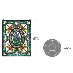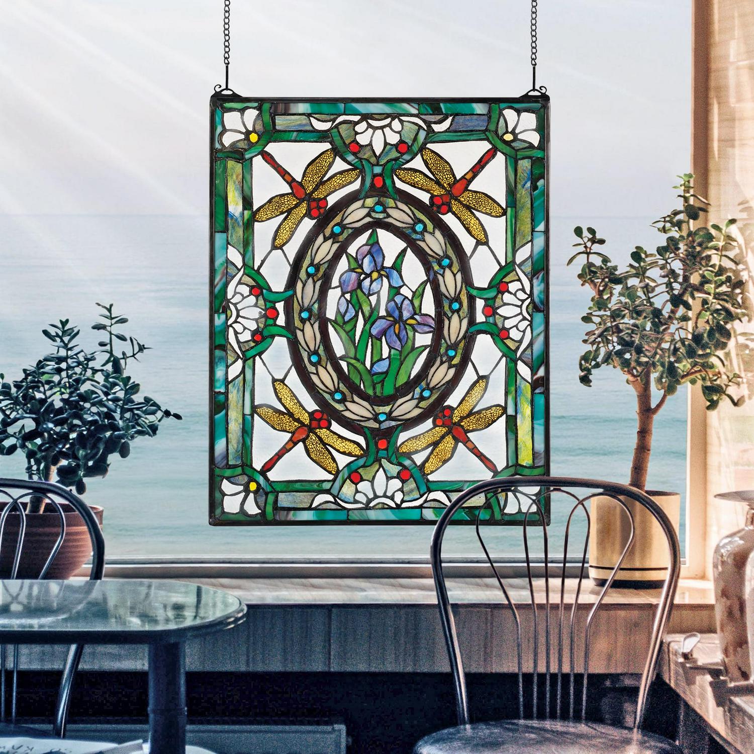 Expanding from a centerpiece of sparkling irises, rings of lilies and dragonflies encircle this over-two-foot-high, Victorian-style window. With precision, each piece of high-quality art glass is hand-cut, copper-foiled, and individually soldered, taking three full days to create. Scroll bracket and chain included for window hanging. This is authentic, hand-crafted art glass; variations of texture and color are part of the process. 19in Wx25in H. 6 lbs.