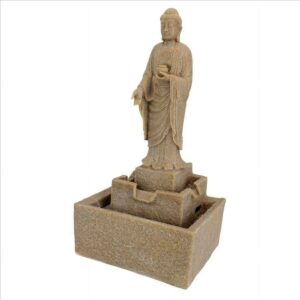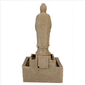 – Our Earth Witness Buddha is depicted with his left hand cupped indicating he has achieved enlightenment. Floating above a radiating LED illuminated double pedestal basin, our Buddha sculpture will become the centerpiece of any Zen garden and creates a peaceful atmosphere. Tranquil cascading streams of water flow to create a meditative retreat. The Earth Witness Buddha Fountain is perfectly sized to be placed anywhere, from a deck to an Asian garden and the fountain boasts an illuminated LED pool to be admired day or night. Cast in quality designer resin and hand-finished to replicate natural sculpted sandstone, our Earth Witness garden fountain features a UL-listed, indoor/outdoor pump that allows you to enjoy the lyrical sound of falling water. Another meditative sculptural fountain from Design Toscano that will make a delightful gift for yourself or a friend! Some assembly required. 12″Wx10″Dx23.5″H. 14 lbs.