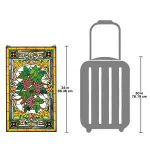 – At almost a yard tall, the dimensions of this art glass masterpiece are as abundant as its bower of cabochon grapes and its rich Tuscan tones. Punctuated with textured glass and sparkling jewels, this exclusive window is crafted with each individually hand-cut piece of art glass copper foiled and encased in glazier’s lead. Includes scroll brackets for hanging at top. This is authentic, hand-crafted art glass; variations of texture and color are part of the process. 19.5″Wx34″H. 12 lbs.