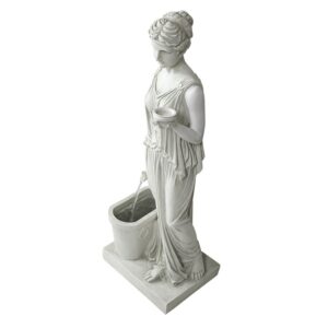 – The ancient Greeks claimed therapeutic benefits from healing waters found in sacred spots – and we’re sure the beautiful water music had benefits all its own! Personifying the eternal beauty of youth, the goddess Hebe, cupbearer to the Olympic gods, becomes a yard-tall fountain as her sparkling waters cascade from cruet urn to basin. Our Design Toscano-exclusive is cast in quality designer resin and hand-finished to replicate fine stonework, this classical focal point is an investment in garden art that features a durable, weatherresistant, integrated, UL-listed, indoor/outdoor pump. Another quality garden fountain from Toscano! Assembly required. 14″Wx12″Dx37.5″H. 31 lbs.