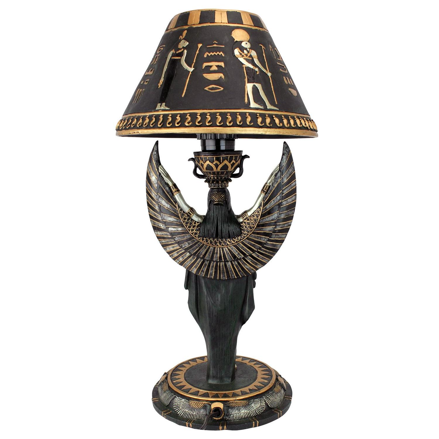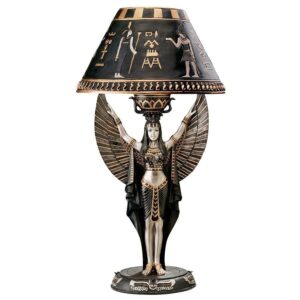 – As the archetype of feminine power and beauty, Isis raises her arms towards the heavens in our replica 1920’s Egyptian Revival lamp. Featuring a resin shade and base, and hand-painted in stunning faux silver, gold and ebony, this sculptural lamp adds historic sophistication to any decor. Switch-on cord; accepts your 40-watt bulb. 9″dia.x17.5″H. 4 lbs.
