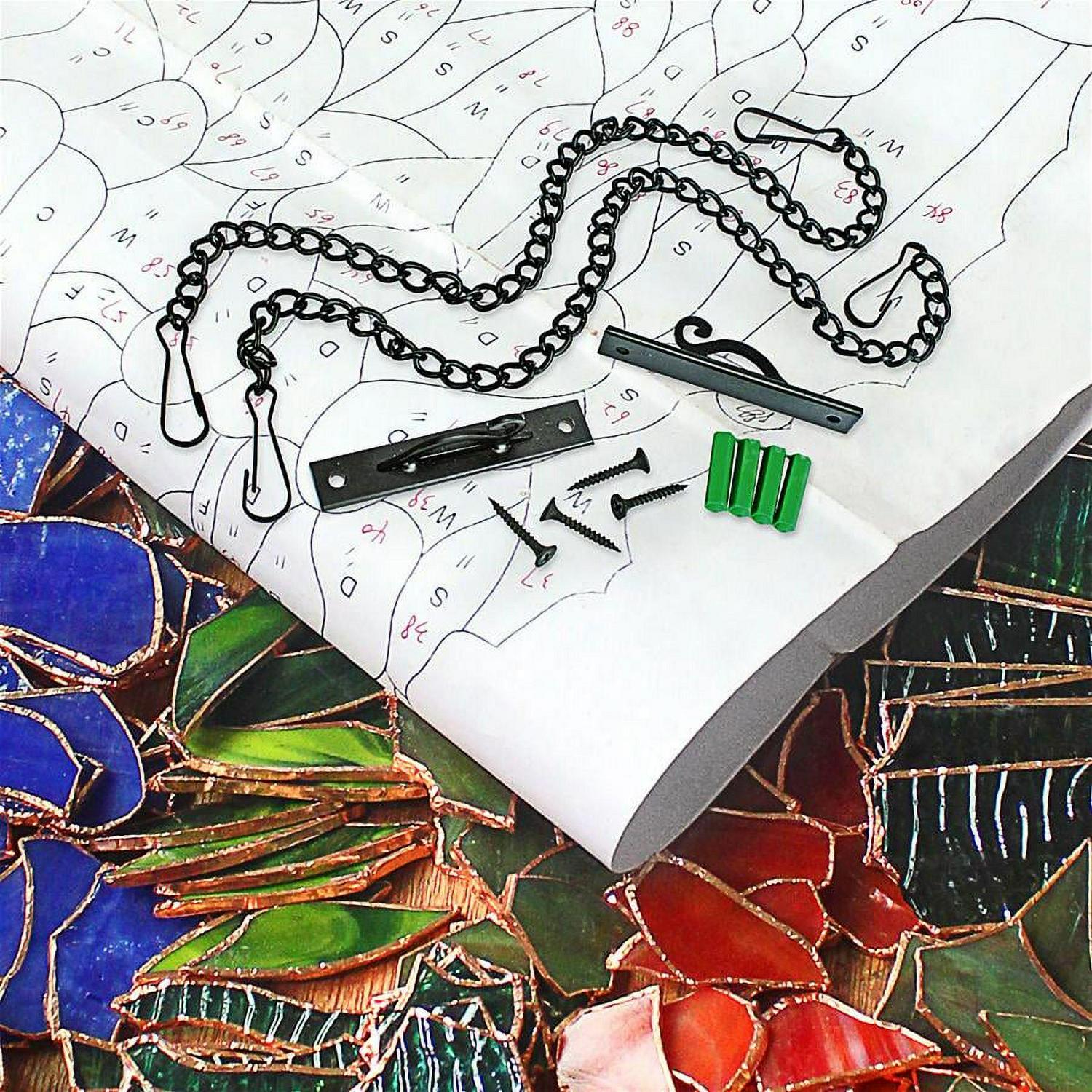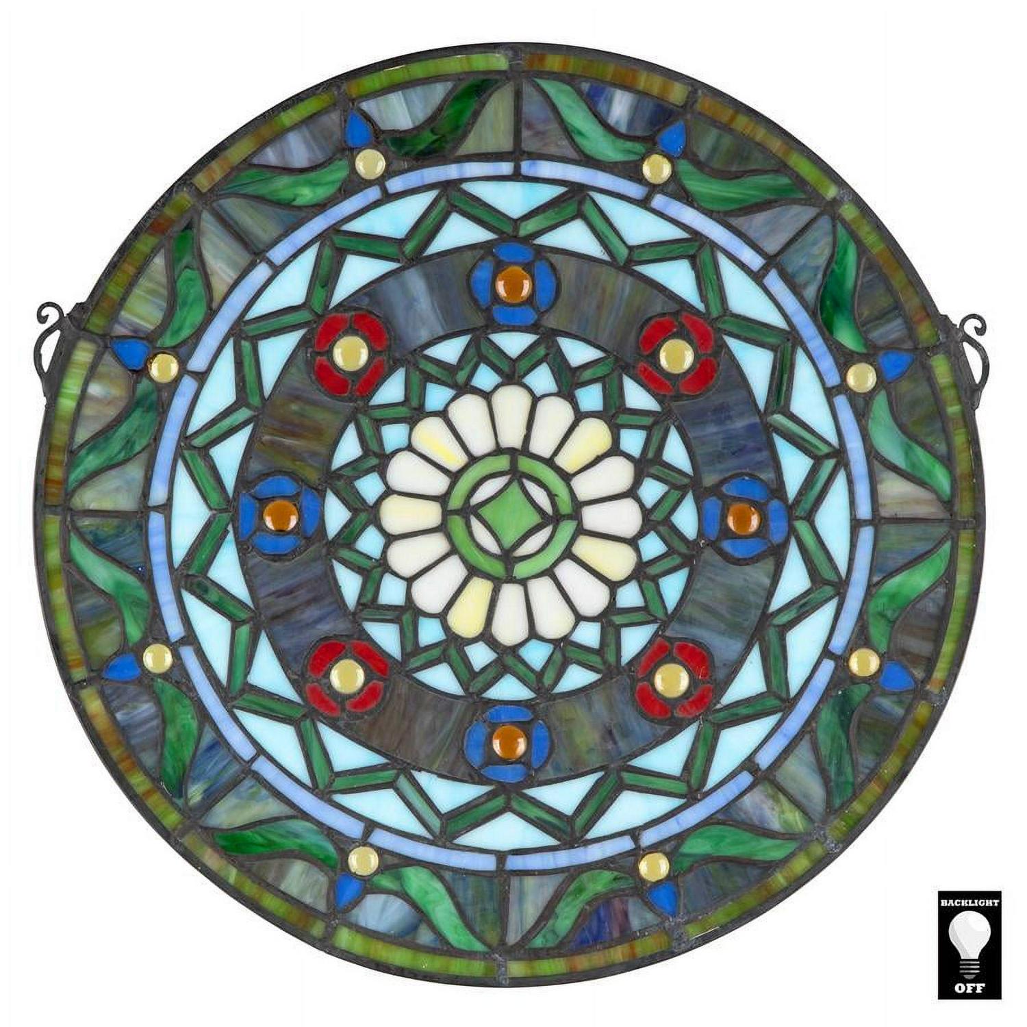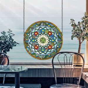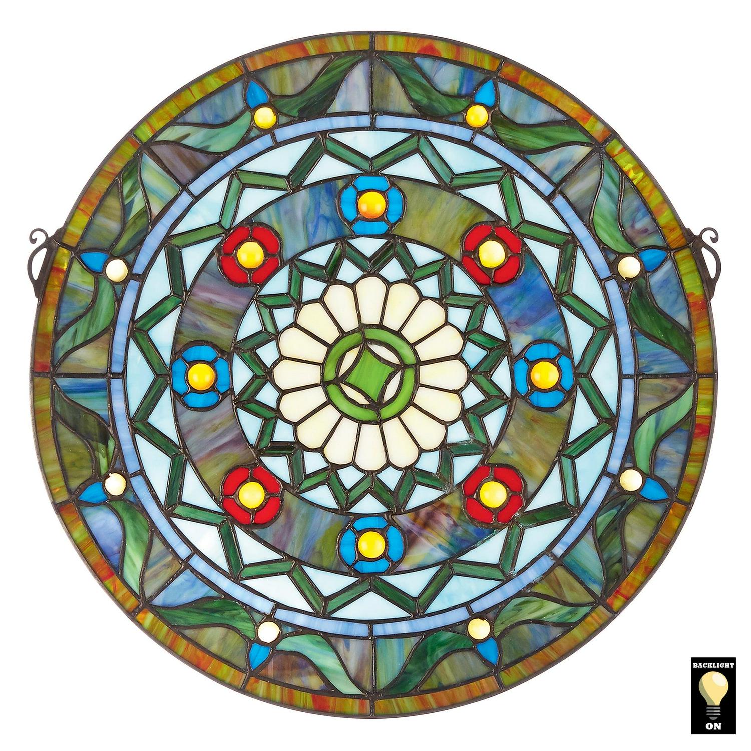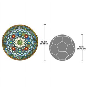 European-style stained glass masterwork encased in glaziers lead Each piece of high-quality art glass is individually hand-cut, copper-foiled and soldered by our craftsmen Authentic, hand-crafted art glass, variations of texture and color are part of the process and give unique character Scroll brackets and chain included for window hanging