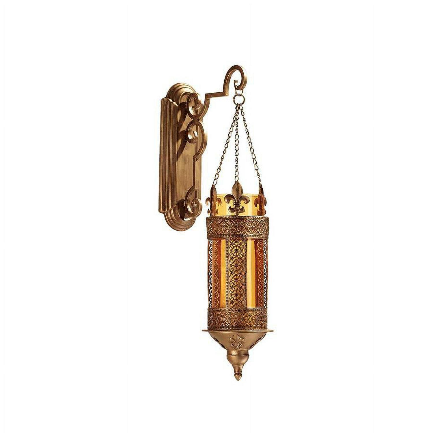 – Imagine several of our jewel-toned pendant lanterns lighting your hallway or lending a romantic glow to an intimate space. With richly ornate, bronze-hued, fleur-de-lis filigree ornamentation and amber glass for protecting the flame of your candle, our functional works of decorative wall art are sure to leave your guests impressed! Pillar candle not included. 7″dia.x19″H. 5 lbs.