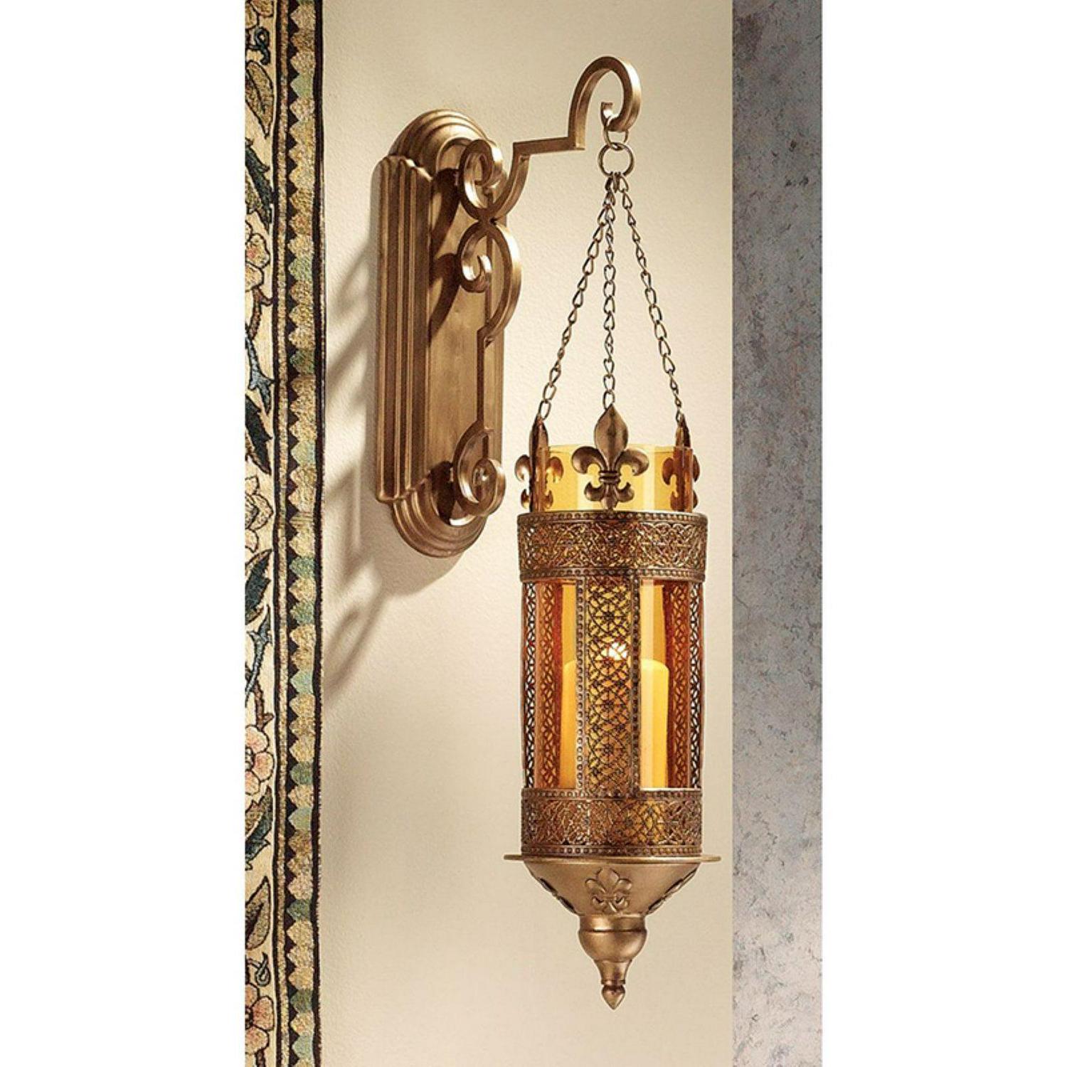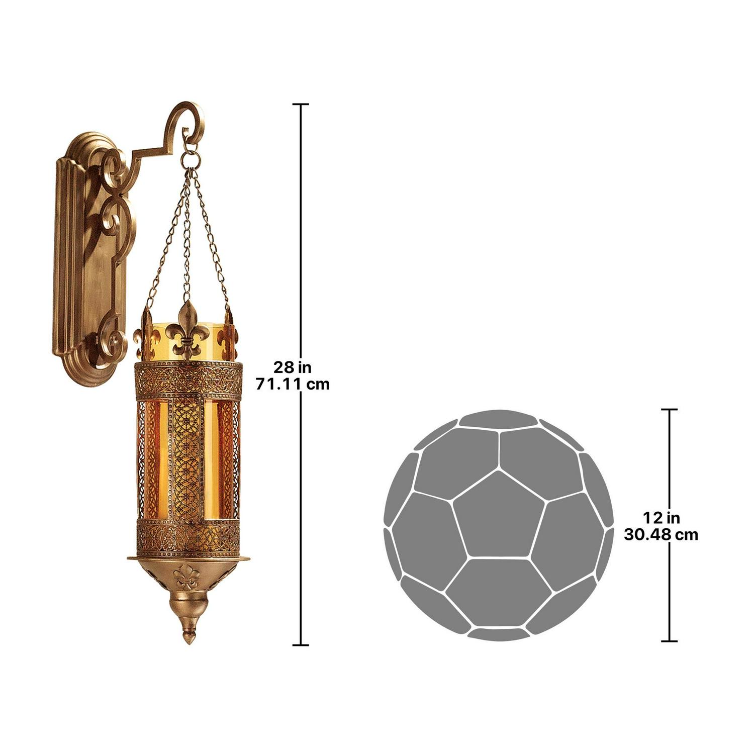 Imagine several of our jewel-toned pendant lanterns lighting your hallway or lending a romantic glow to an intimate space. With richly ornate, bronze-hued, fleur-de-lis filigree ornamentation and amber glass for protecting the flame of your candle, our functional works of decorative wall art are sure to leave your guests impressed! Do not leave lit candles unattended. Candles not included. 7in dia.x19in H. 5 lbs.