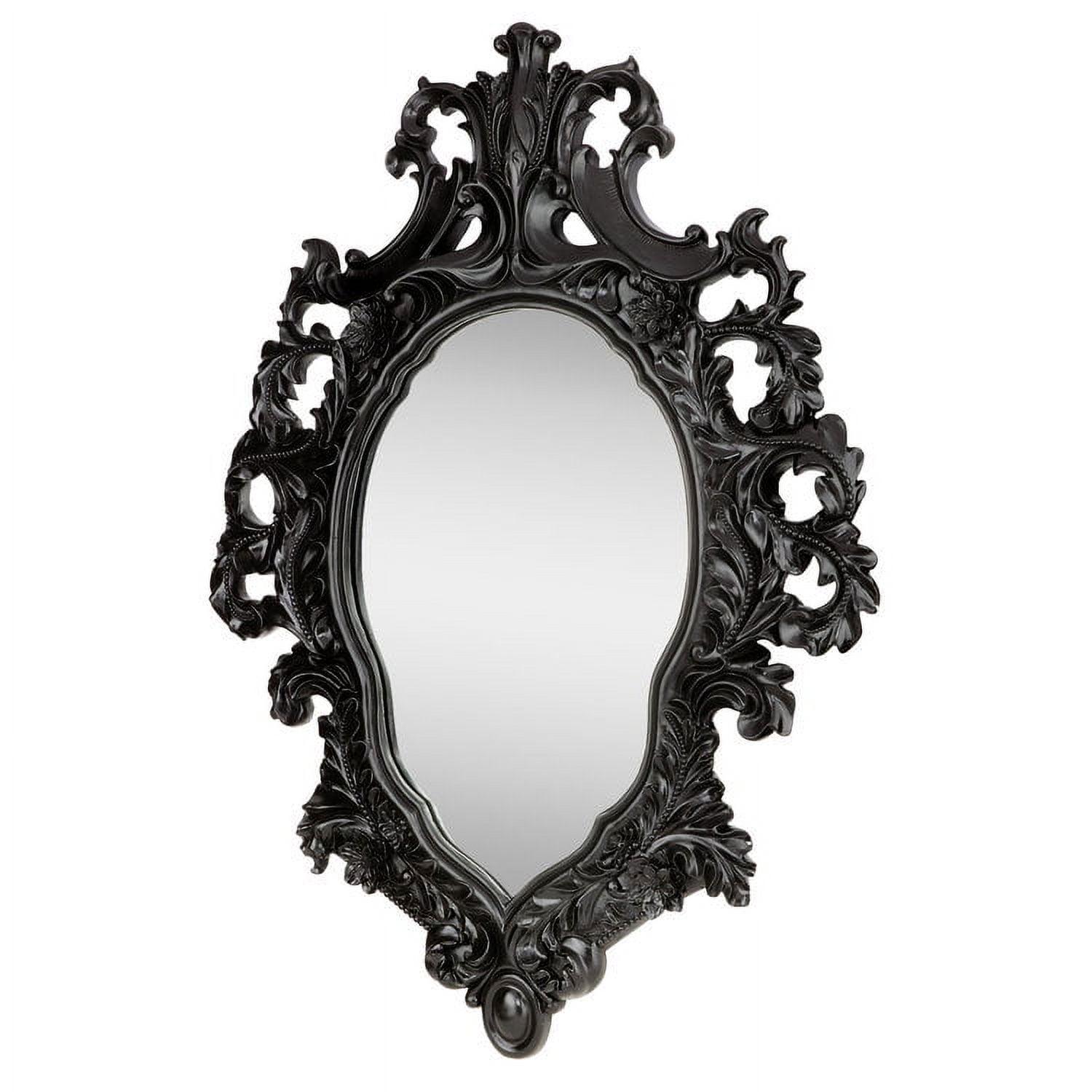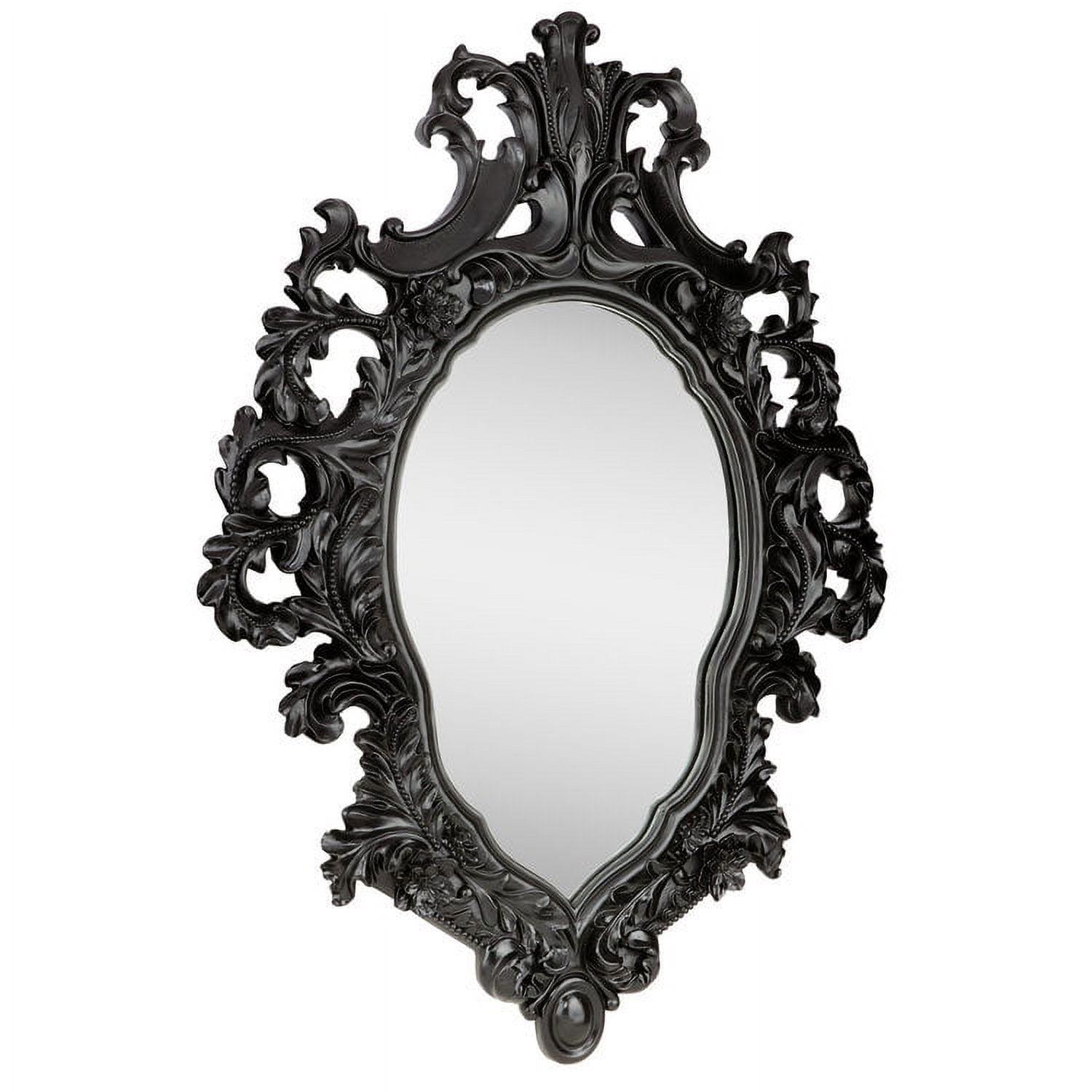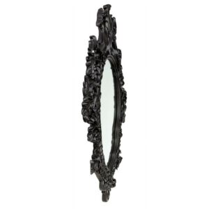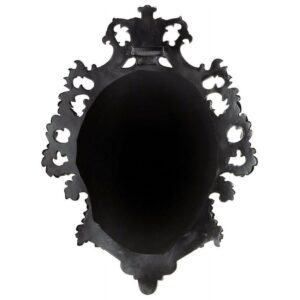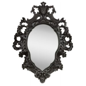 – This generously sized salon mirror sparkles to reflect its own ornate, beribboned sculpt! A garland of roses graces our replica 17th century antique, inspired by French Rococo styling found in the grand salons of Paris. Cast in quality designer resin and hand painted in a satin ebony finish, this Basil Street Gallery exclusive is striking as a centerpiece above a mantel or as the signature of a stylish entryway. 28″Wx2.5″Dx36.5″H. 20 lbs.
