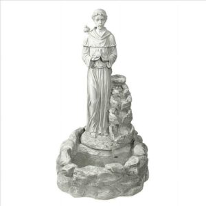 Create a place of quiet contemplation with the lilting water music surrounding our Italian patron saint of nature. St. Francis, so gentle that birds nest in his hands, composes soothing sounds as water cascades down the quality cast designer resin rocks into the reflecting basin below. With a fine stonework finish, this classic, exclusive sculptural fountain is an investment in garden art and a truly spiritual resting place. Features an integrated, UL-listed, indoor/outdoor pump. Simple assembly required. 16″W x 20″D x 29″H. 22 lbs.