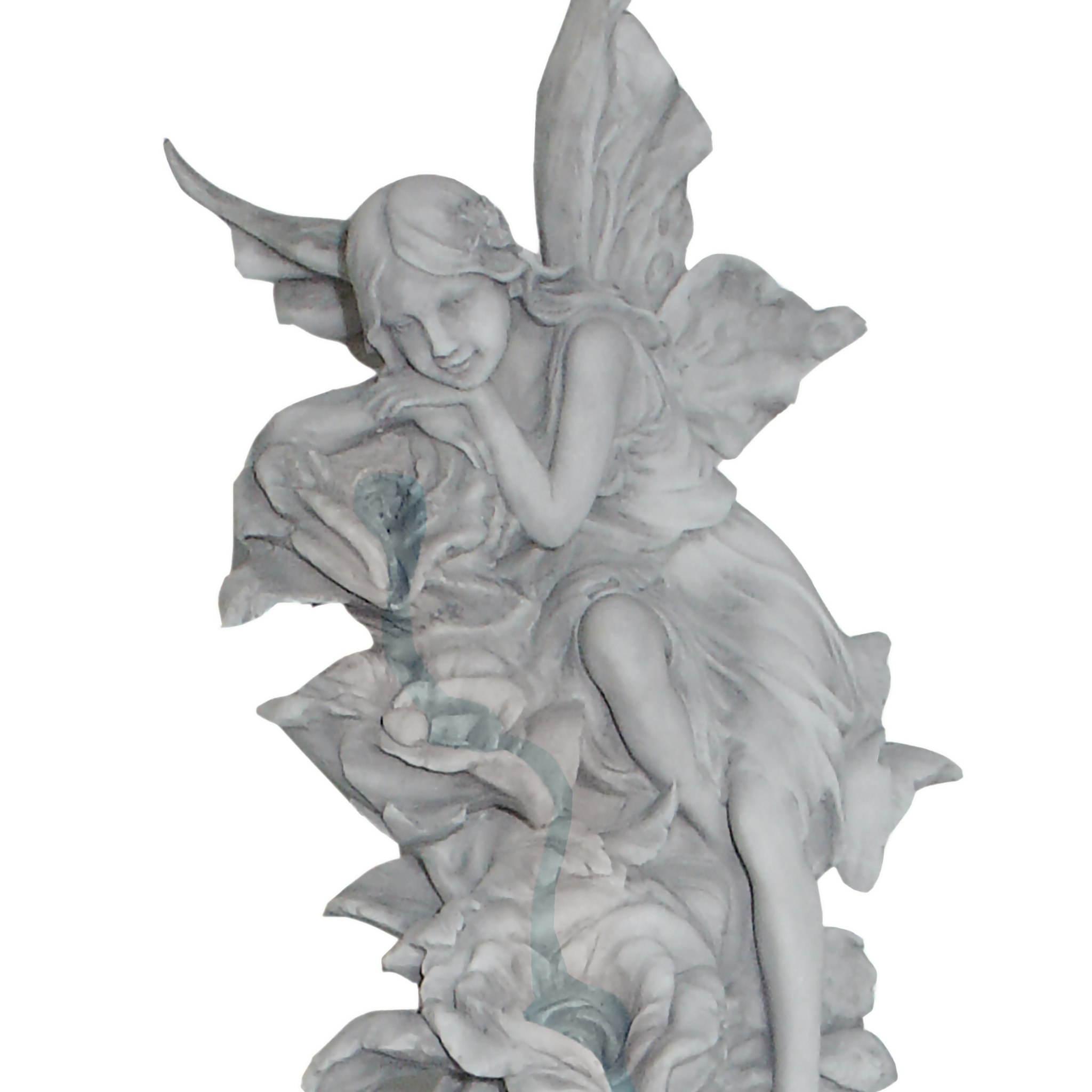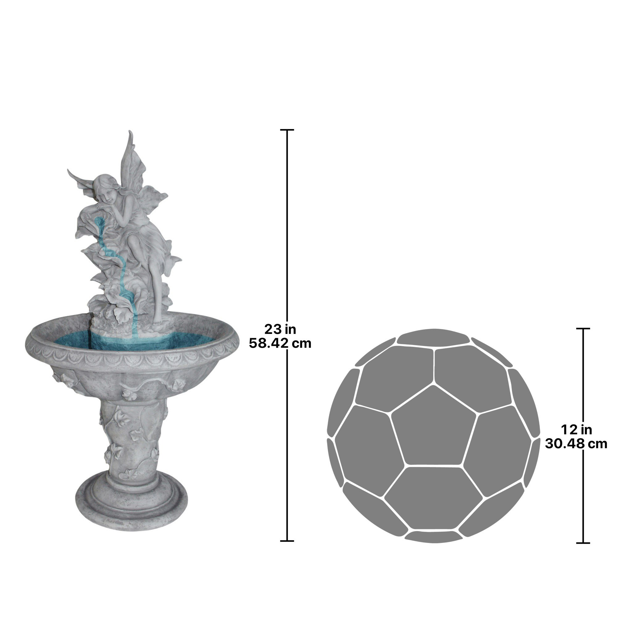 – A beautiful fairy welcomes water music from cascading teardrop-shaped leaves in this angelic fountain sure to be the crowning statement in your garden. Sharing her sparkling aqueous gift, a winged fairy rests atop this pedestal-based, Design Toscano-exclusive fountain. Cast in quality designer resin and hand-finished to replicate fine stonework, this investment in garden art features an integrated, UL-listed, indoor/outdoor pump. Simple assembly required. 14″dia.x23″H. 12 lbs.