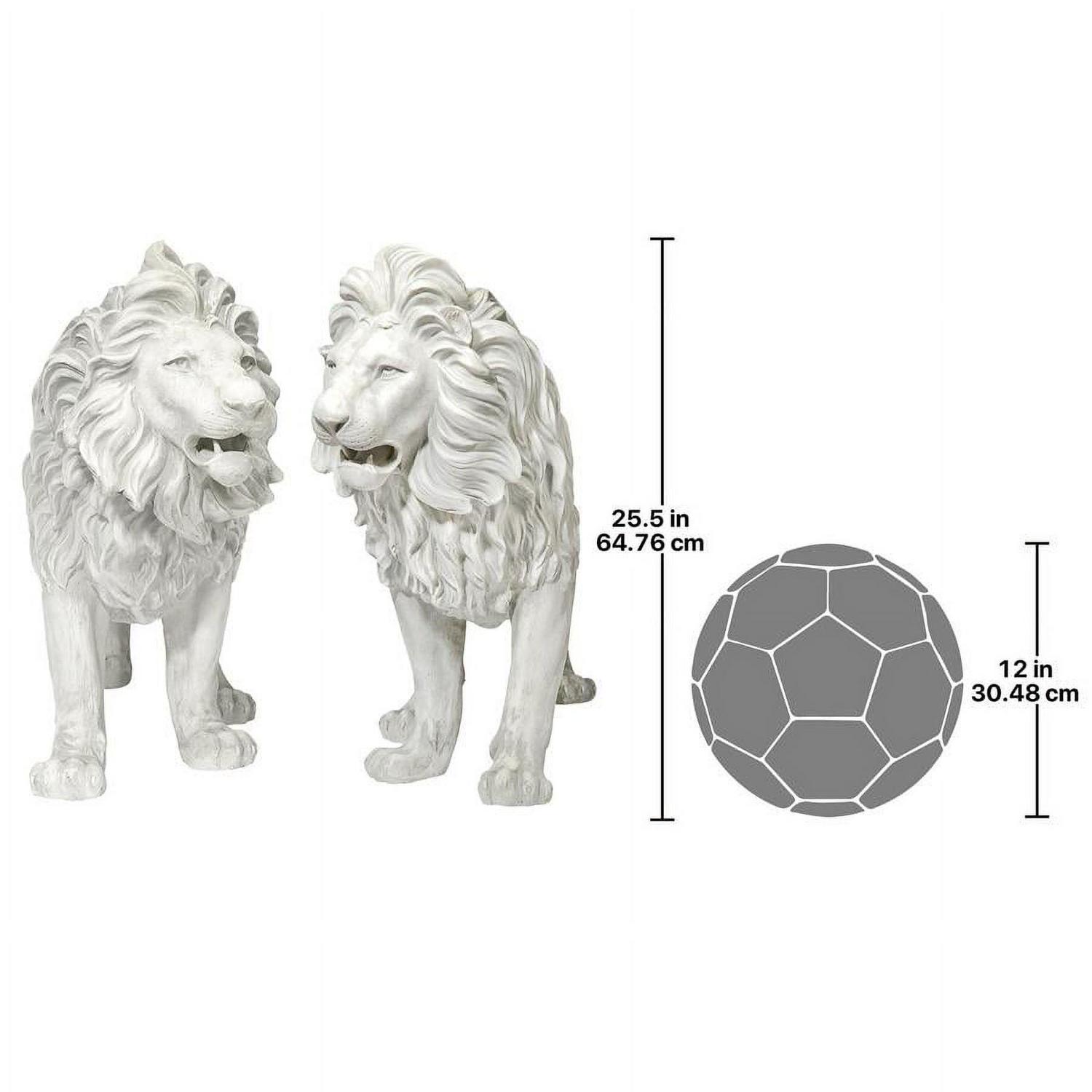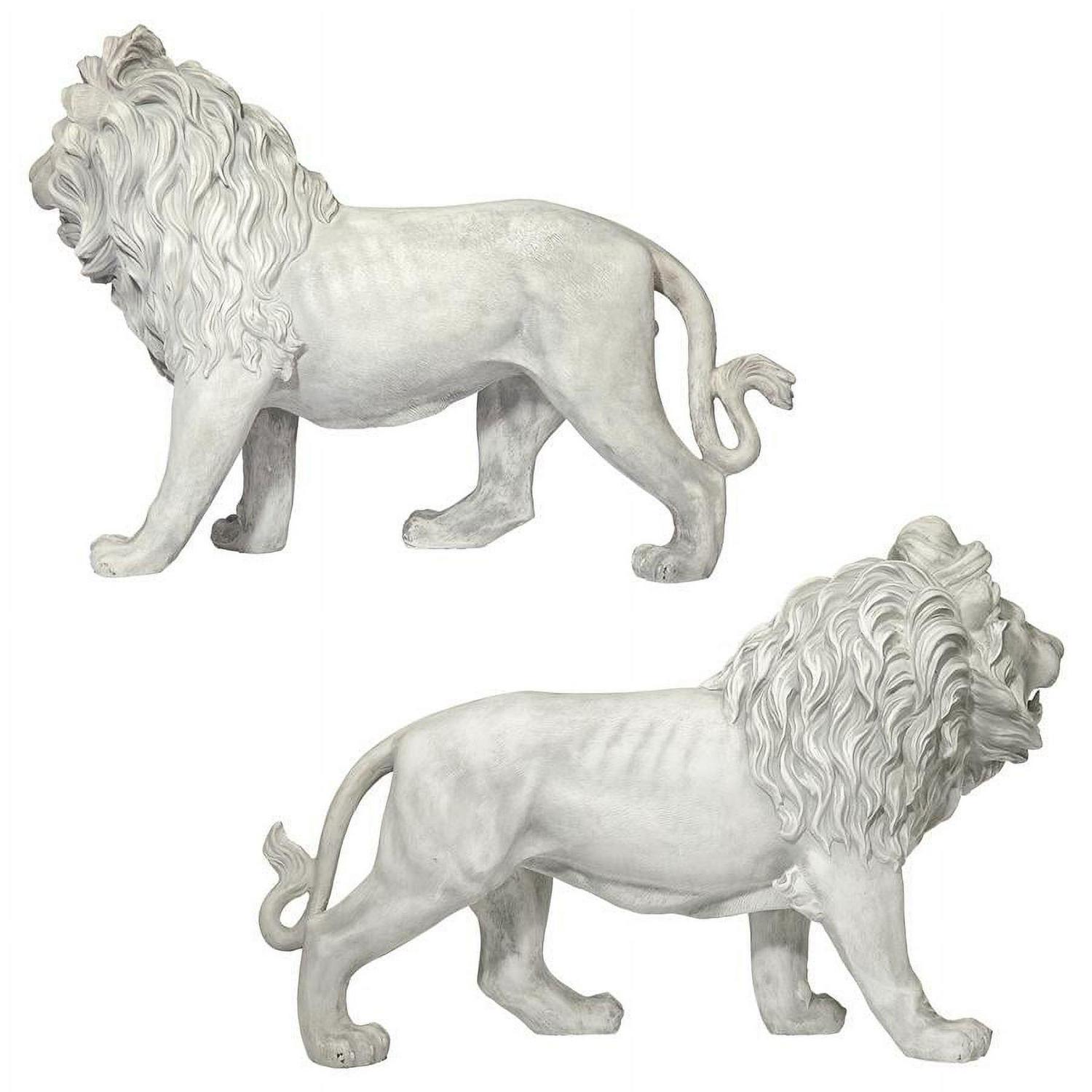 Add the subtle sophistication of these magnificent sculptural lion sculptures to your own home or garden. Muscular, three-foot-long bodies poised in mid-stride, these powerful lion statues are the embodiment of strength and courage. Our powerfully muscular classic art animal sculptures will lend quiet strength and courage whether flanking an entryway or standing sentinel near a garden gate. Unparalleled as classic art, our enviable, quality designer resin, faux stone lion sculptures are a study in affordable elegance. Each approx. 12in Wx37in Dx25in H. 19 lbs.