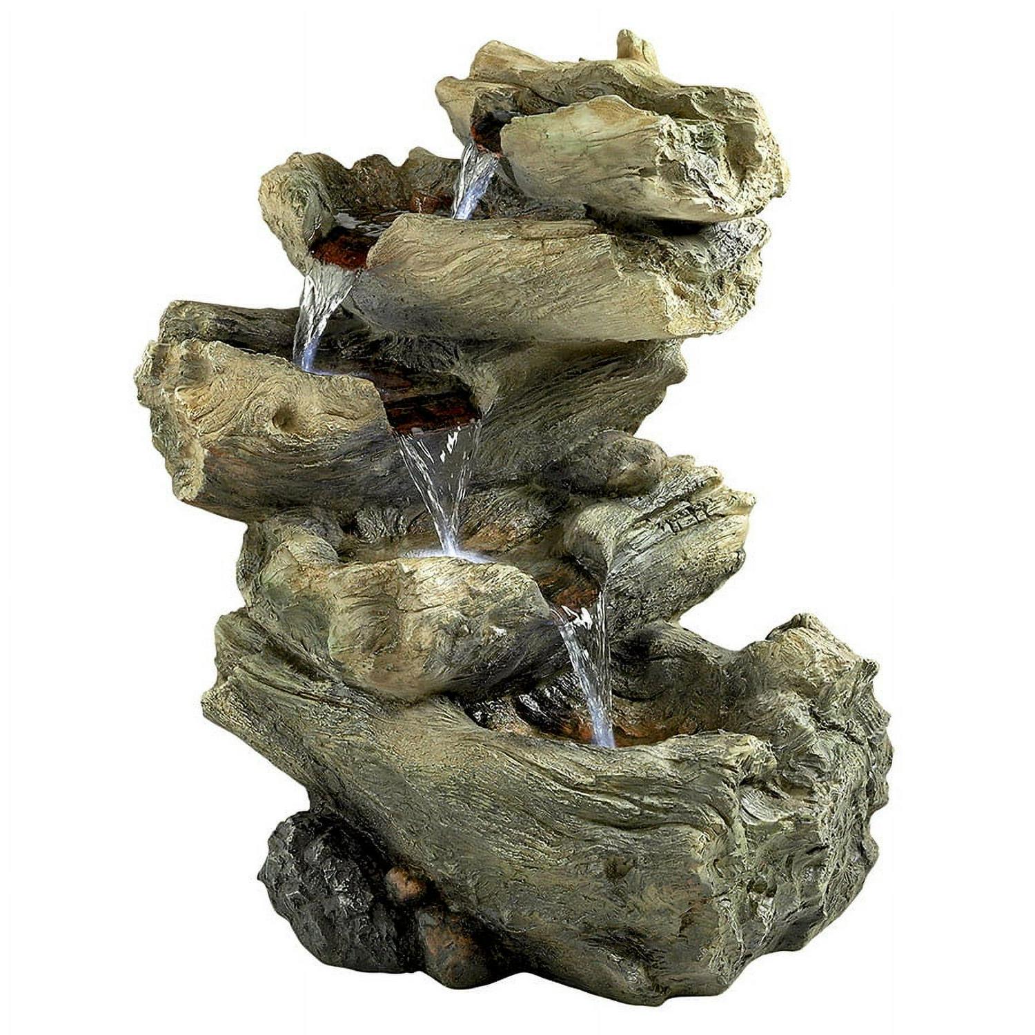This spectacular Roaring River Cascading Garden Fountain is sure to be the crowning statement wherever you place it, either in the garden, on your patio, or in an entryway. Multiple cascading streams of water flow down five pools to create an in-home oasis and peaceful, natural atmosphere. With four of the basin pools highlighted by an included LED light kit, you can even enjoy this garden fountain in the evening. It can be placed indoors or out and constantly recycles water from a hidden reservoir. Cast in quality designer resin and hand-finished to replicate natural wood, our garden fountain also features a UL-listed indoor/outdoor pump. From Design Toscano, the Roaring River Cascading Garden Fountain is so realistic you might find beavers playing there! Simple assembly required. 19in Wx12in Dx21½in H. 20 lbs.