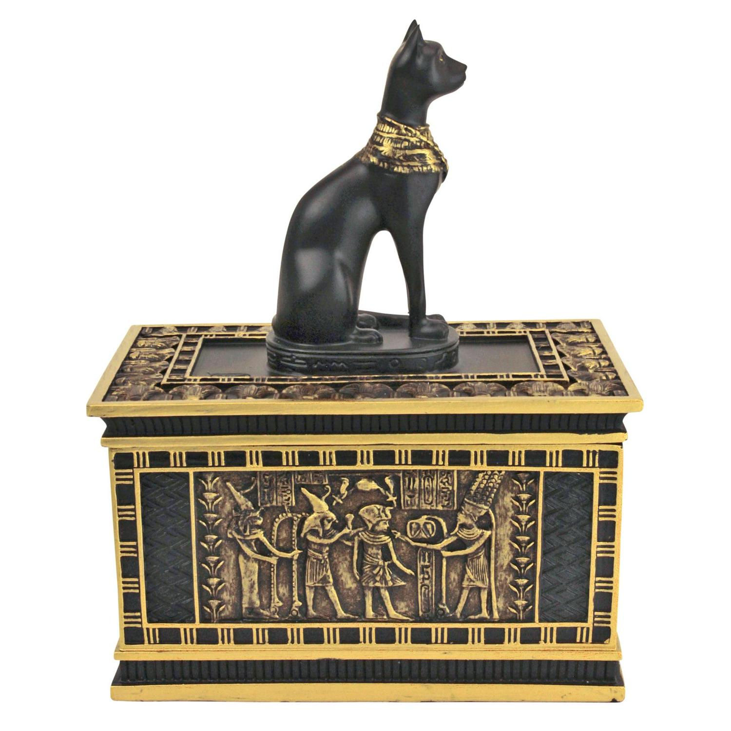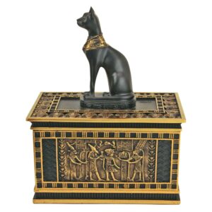 – The royal cat goddess sits atop a sarcophagus laden with elaborate Egyptian imagery in this hand-painted, quality designer resin work of decorative art created exclusively for Toscano. Hand-painted in faux gold and ebony as the perfect gift! 4.5″Wx3″Dx6″H. 1 lb.