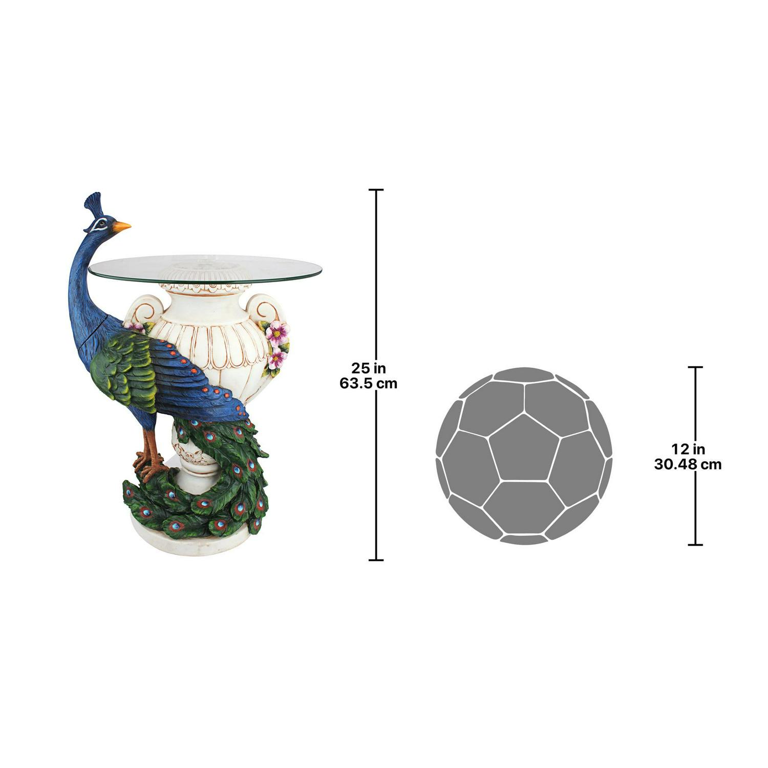 – Set your lamp, greenery or favorite beverage atop this fully functional table inspired by peacocks like those that have roamed the Netherlands Staverden Castle since the 1400’s. The graceful, organic form of this majestic bird has been sculpted 360-degrees in an artistic serpentine curve so that you may admire it on all sides. From its plumed head to the colorful peacock feathers that wrap a faux alabaster vase, it is cast in quality designer resin, each feather is hand painted in the bird s royal palette exclusively for Design Toscano. Simple assembly required. See our bestselling companion statue in antique stone, KY1876. 17.5″Wx16″Dx25″H. 14 lbs.