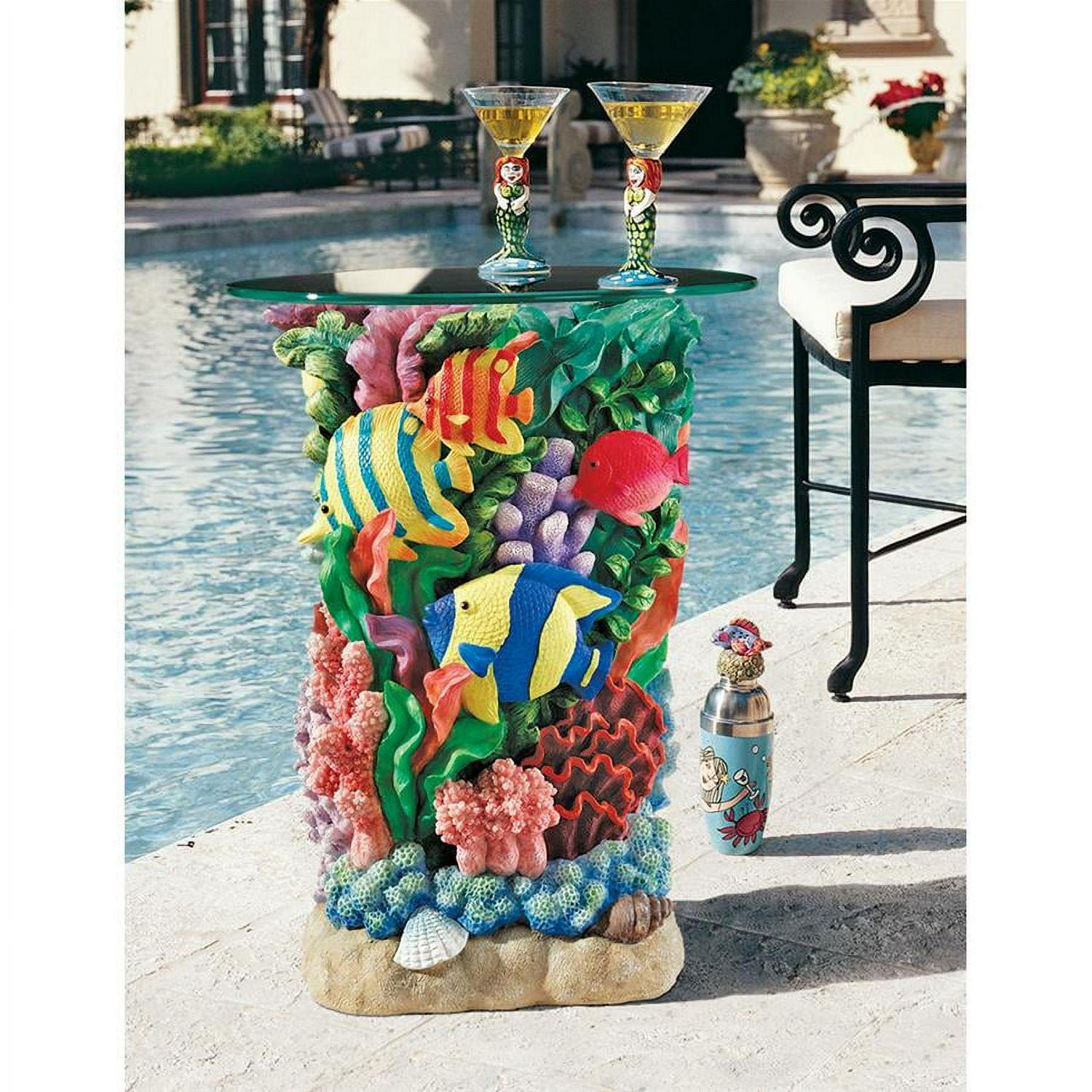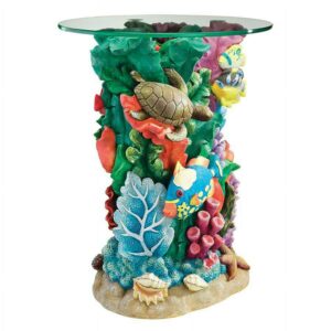 – Sea turtles, starfish and shells surround the colorful coral that rises to provide an aquatic home for angel fish and other beautiful creatures of Australia’s Great Barrier Reef in this distinctive, quality designer resin table base with the accent of parts Down Under. Our Toscano exclusive is hand-painted in bold colors, then fitted with a 16″ diameter, 3/8″-thick, pencil-edged round glass top that makes it perfect poolside or accenting a spa. 16″dia.x21″H. 15 lbs.