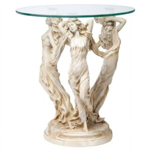 – The Muses, Greek goddesses of poetry, art, and science, are compelling design elements in this artistically rendered table boasting style and function. The muses shapely forms are cast in quality designer resin and finished to replicate aged stonework. This classic celebration of nature is displayed beneath and 18″ diameter x 20″ H. 30 lbs.