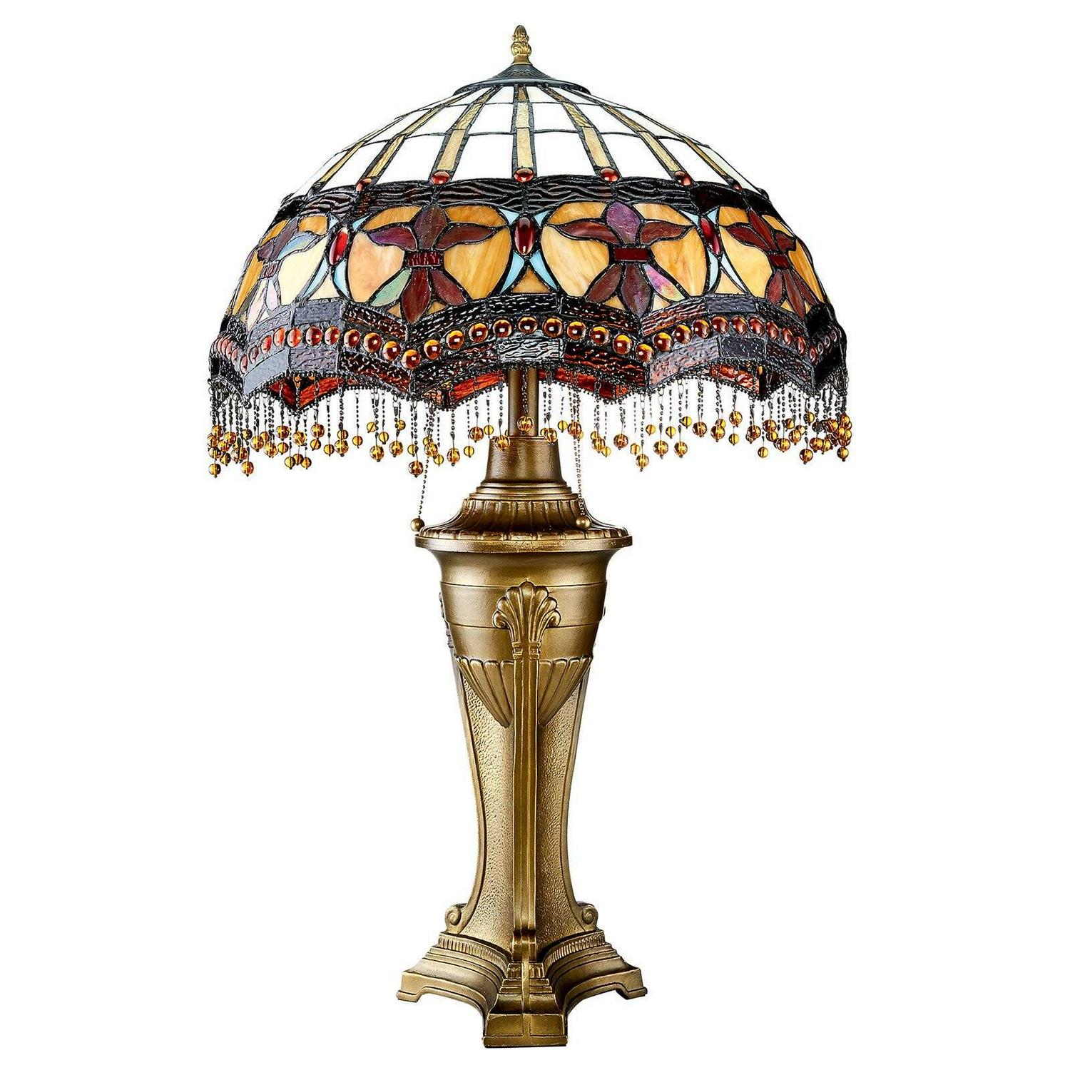 – Drawing upon the style and techniques of the master of stained glass, Lewis Comfort Tiffany, this turn-of-the-century replica Victorian Parlor Lamp casts a softly diffused, golden wheat-colored light over all in its influence. Our Toscano authentic stained glass lamp features individually hand-cut and soldered authentic art glass in stylized floral motifs that give way to 130 ruby cabochons and a fringe of glass beads. The over two-foot tall table lamp accepts your three 60-watt bulbs and is turned on via a switch on socket. Set atop an Arts and Crafts-style antique bronze-finished zinc metal base. Simply assembly required. This is authentic, hand-crafted art glass; variations of texture and color are part of the process. Table Lamp: 20″dia.x29.5″H. 18 lbs.