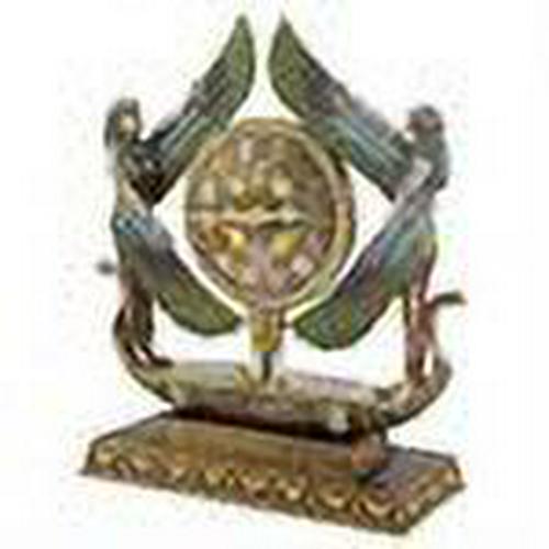 – With wings spread to showcase a beautiful quartz clock with hieroglyphic numerals, double Isis figures ride a foot-long barge to the Afterworld in this stunning Egyptian Revival work. True to the decorative arts of the 1920’s, this quality designer resin statement work blends style and function as it glows in the rich palette of the ancient world. Accepts your single AA battery. 13.5″Wx5″Dx16″H. 7 lbs.
