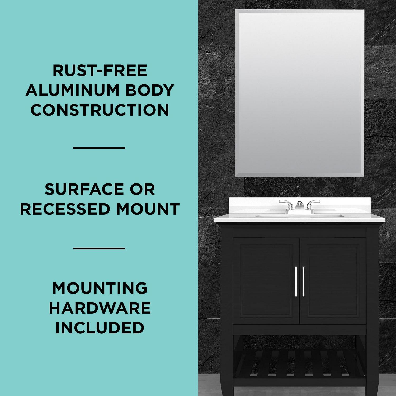 - Features: rust-free aluminum body, Beveled Mirror, surface or recess mount