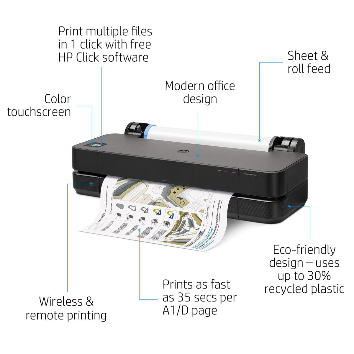 Print speed 35 sec/page on D, 68 D prints per hour Print resolution Up to 2400 x 1200 optimized dpi Technology HP Thermal Inkjet Margins Roll: 0.2 x 0.2 x 0.2 x 0.2″ (5 x 5 x 5 x 5mm) Sheet: 0.2 x 0.2 x 0.2 x 0.2″ (5 x 5 x 5 x 5mm) Ink types Dye-based (C, M, Y); pigment-based (K) Page Yield 20ml of ink yields 101 A1/D pages, taking into account maintenance routines Ink drop 5.5 pl (C, M, Y); 12 pl (K) Printheads 1 (cyan, magenta, yellow, black) Printhead nozzles 1376 Line accuracy +/-0.1% Minimum line width 0.0008″ (0.020mm) Max optical density 8 L min/2.10 D Handling Sheet feed, roll feed, automatic horizontal cutter Roll size 11 to 24″ (27.94 to 60.96cm) Sheet size 8.3 x 11 to 24 x 74.7″ (21 x 27.94 to 60.96 x 189.73cm) Standard sheets A, B, C, D Grammage 60 to 280g/sq. m Thickness Up to 11.8 mil Applications Line drawings Presentations Renderings Memory 512MB Hard disk None Interfaces Gigabit Ethernet (1000Base-T), Hi-Speed USB 2.0, Wi-Fi 802.11a/b/g/n, Wi-Fi Direct Native print languages JPEG, URF Printing paths Print Anywhere with HP Smart app, HP Click, HP driver for macOS, HP driver for Windows, printing support for Chrome OS, email printing, HP Print Service Plugin for Android, Apple AirPrint Drivers Raster driver for Windows and macOS HP Software and solutions HP Click, HP Smart app, HP Print Preview for Windows, HP Easy Start, HP DesignJet Utility for Windows, HP Support Assistant Remote print enabled Yes One-click multi-size printing Yes Recycled plastic in printer 30% Operating temperature 41 to 104 Degree F (5 to 40 Degree C) Operating humidity 20 to 80% RH Operating altitude Up to 9843′ (3000m) Storage temperature -13 to 131 Degree F (-25 to 55 Degree C) Sound pressure 42 dB(A) (operating), <16 dB(A) (idle) Sound power 5.8 B(A) (operating), <3.4 B(A) (idle) Consumption <35 W (printing), <5.6 W (ready), <2.1 W (sleep), <0.2 W (standby) Requirements Input voltage (auto ranging): 100-240 V ( +/-10%), 50/60 Hz ( +/-3 Hz), 1200 mA max Safety USA and Canada (CSA certified), EU (LVD, EN 60950-1 and EN 62368-1 compliant),Russia, Belarus, Khazakstan (EAC), Ukraine (UA), Singapore (PSB), China (CCC), Argentina (IRAM), India (BIS), Mexico (NYCE) Electromagnetic Compliant with Class B requirements, including: USA (FCC rules), Canada (ICES), EU (EMC/RED Directives), Australia (ACMA), New Zealand (RSM), China (CCC), Japan (VCCI), Certified as Class B product: Korea (KCC) Environmental ENERGY STAR, WEEE, EU RoHS, EAEU RoHS, REACH, ErP, EPEAT Gold Dimensions (W x D x H) 39.9 x 17.3 x 11.2" (101.34 x 43.94 x 28.44cm) Weight 47.4 lbs (21.5kg)