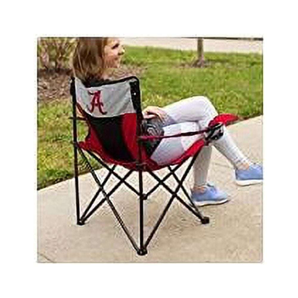 Logo Brands Camping Chair, Blue: Seating area measures 22″ x 34.5″ x 34.5″ with double layered 600 denier polyester Features 2 adjustable arm rests with cup holders on each arm Mesh material in middle allows for breathability Logo featured on the front and back of headrest and the carrying bag Seats up to 250 lbs