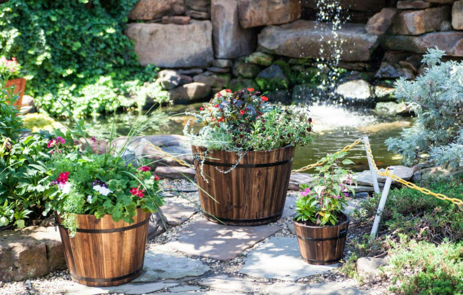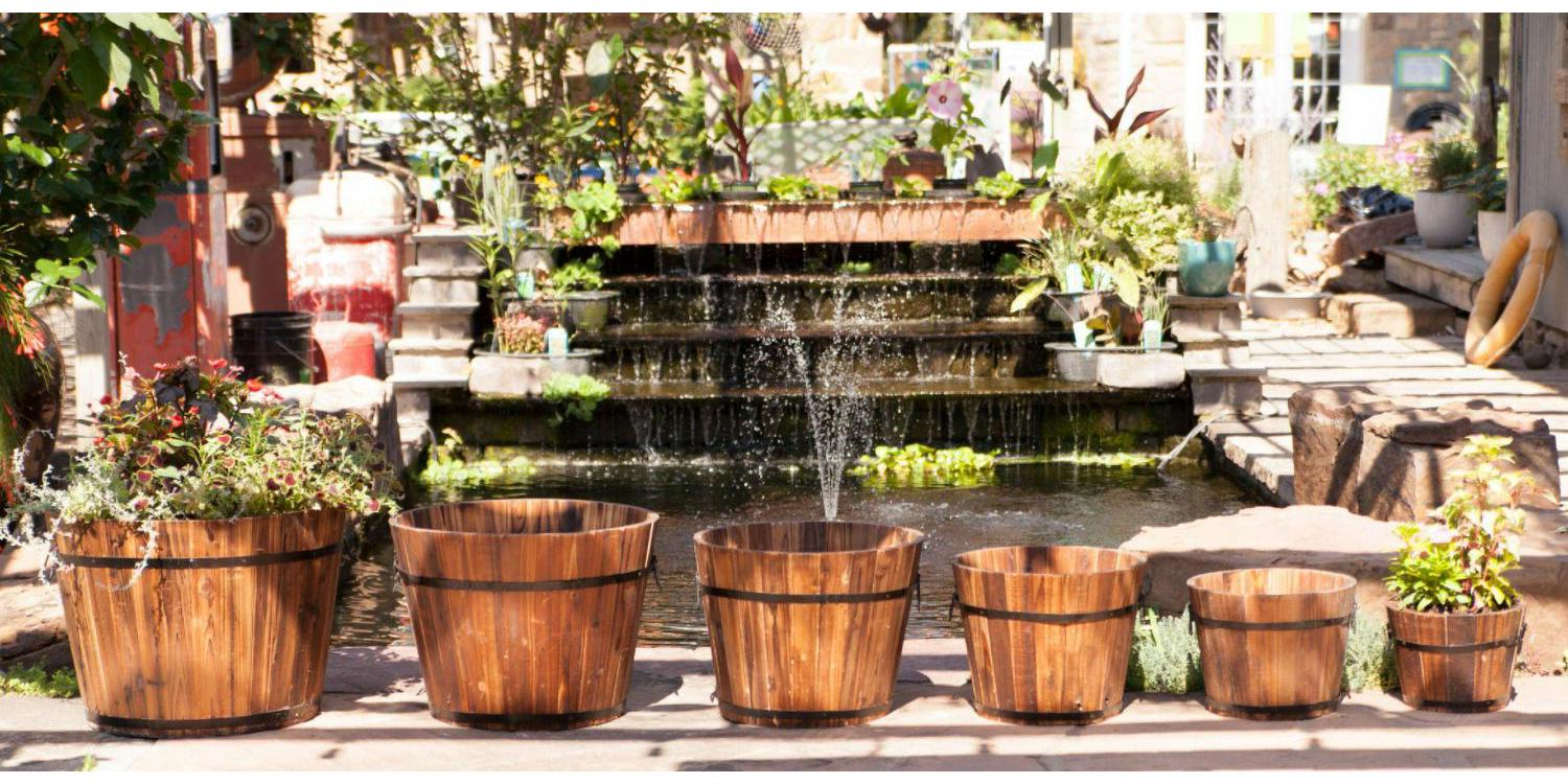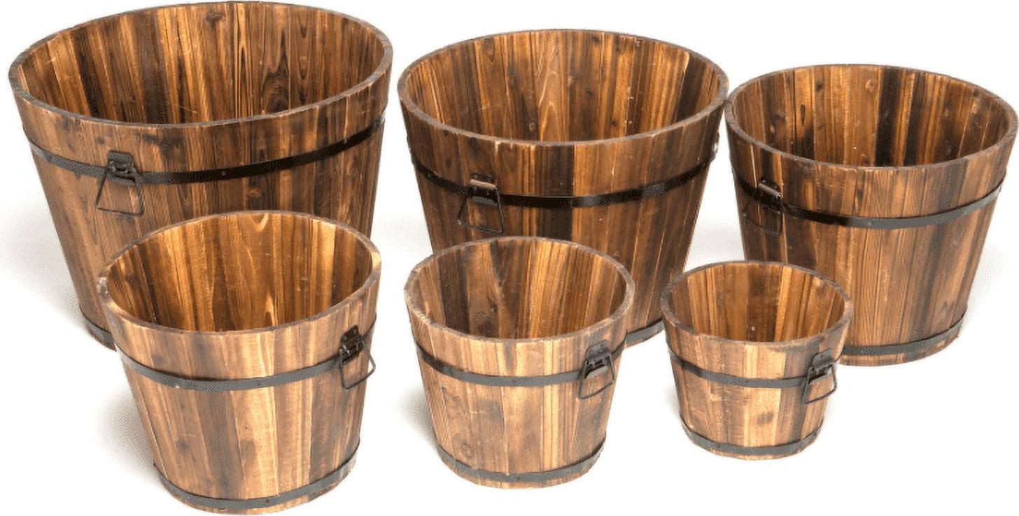 Well constructed planter with a stained finish. Planter tightens naturally when filled with dirt and water. DeVault Enterprises 6 Piece Wooden Whiskey Barrel Planter Set. Set of 6 the set includes different-sized planters to accommodate different-sized plants. Constructed of weatherproof cedar, these planters will look great in your yd or on your deck. It gives attractive Display For Outdoor Living Area.