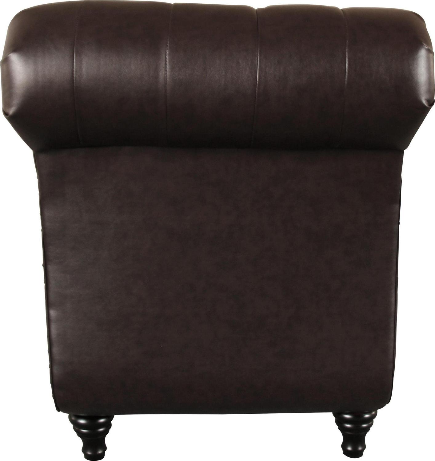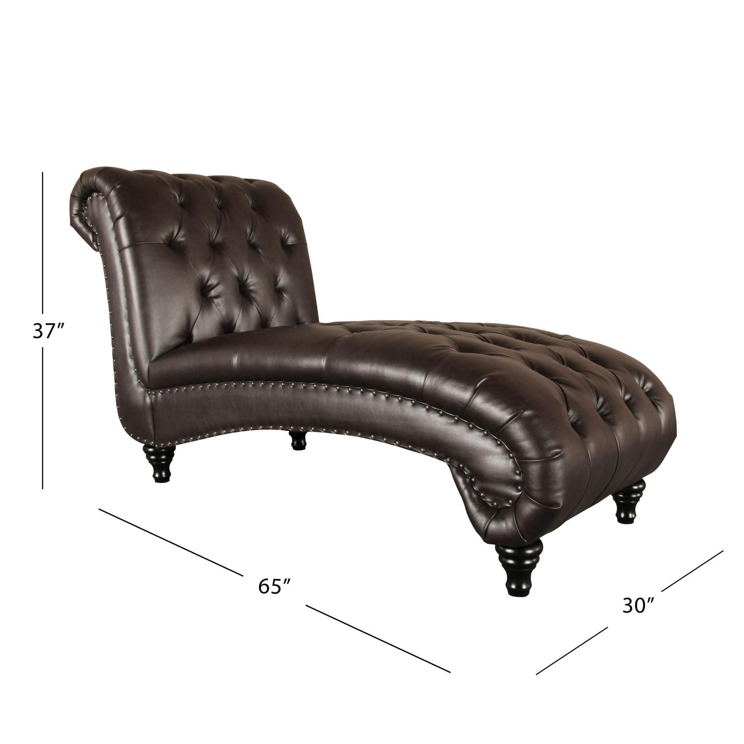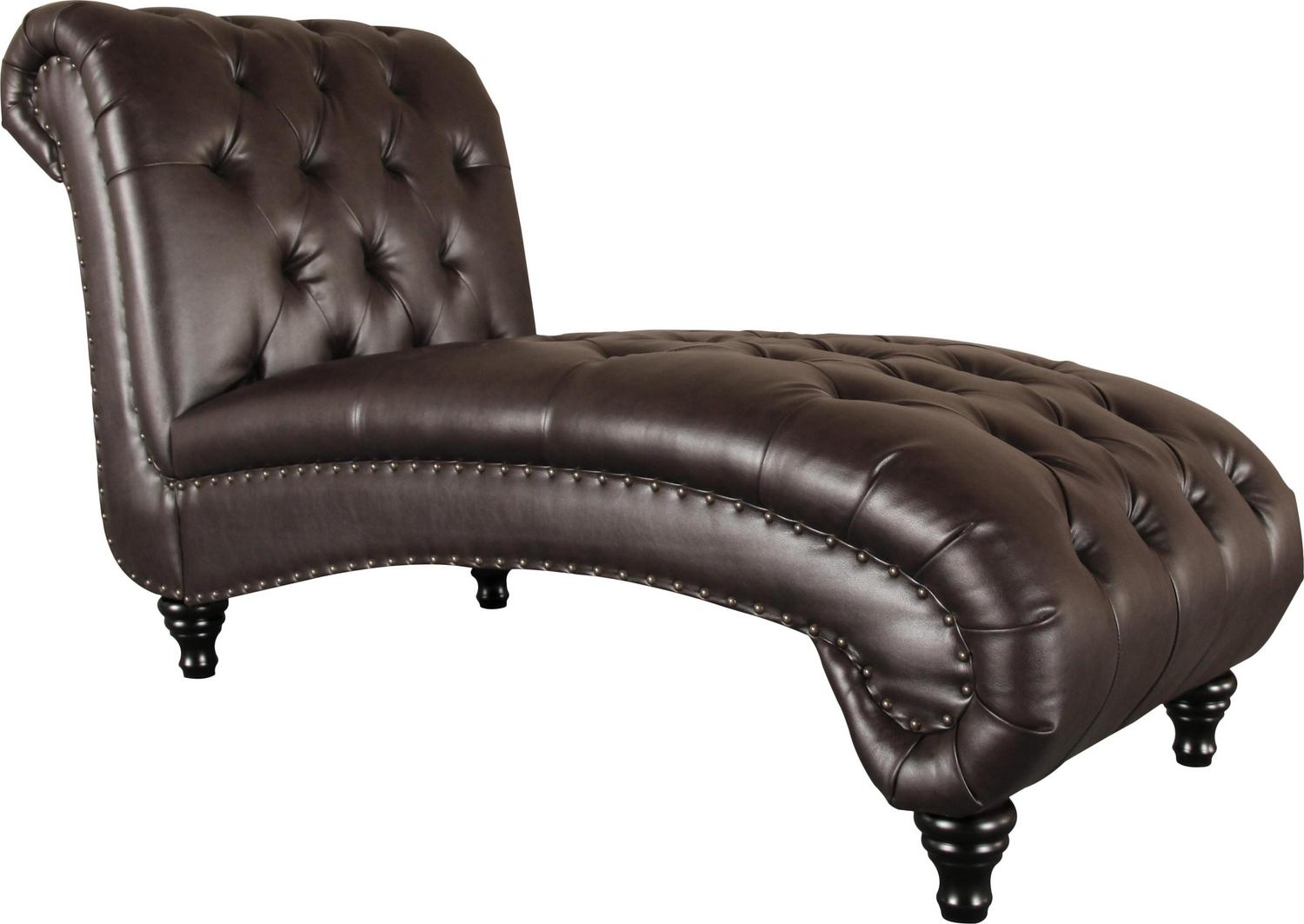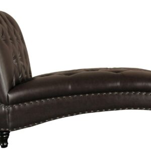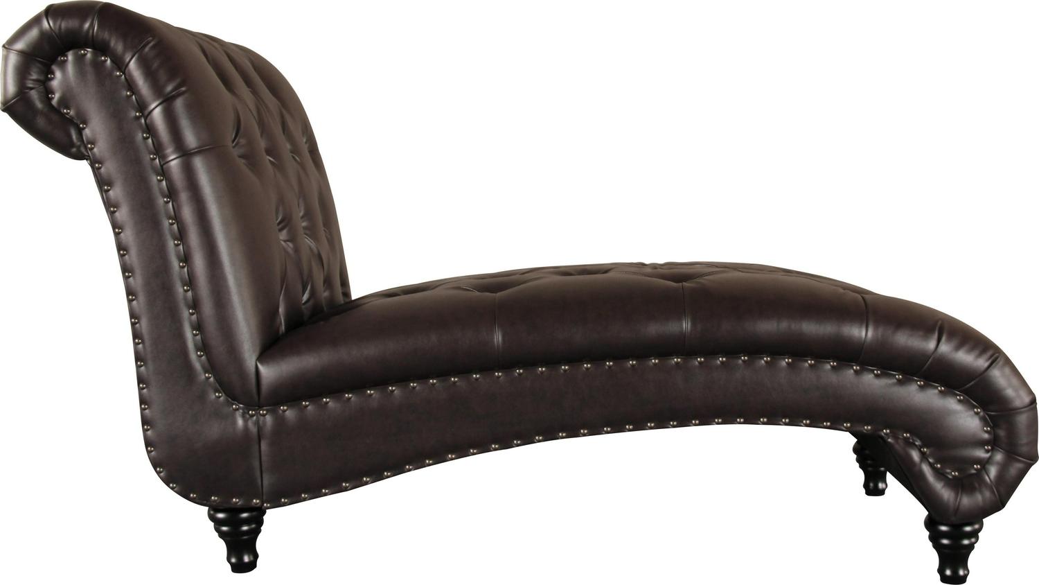 Lounge in classic style with the Alex chaise. The sculptural kiln-dried hardwood frame is padded with high-resiliency foam, upholstered with bonded leather, and detailed with button-tufting for Traditional depth. Choose from four colors, each accented with brass nail head trim for a hint of shine.