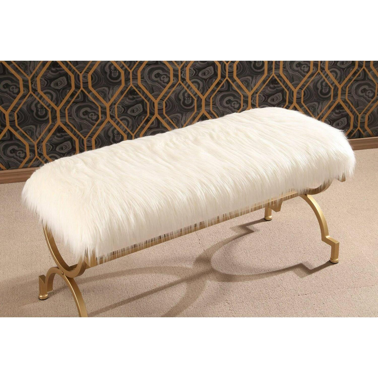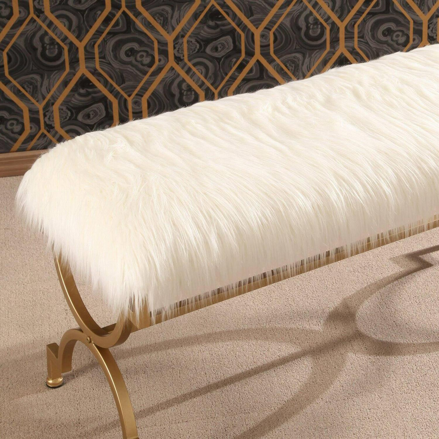 For an elegant entryway or a luxurious bedroom seating area, enjoy the Karen Faux Fur Bench. This beautifully crafted bench offers a comfortable upholstery topping a glamorous metal frame. If you need the perfect touch on your Hollywood-inspired decor, or if you re looking for inspiration to design a room around, this bench is a memorable addition to your home.