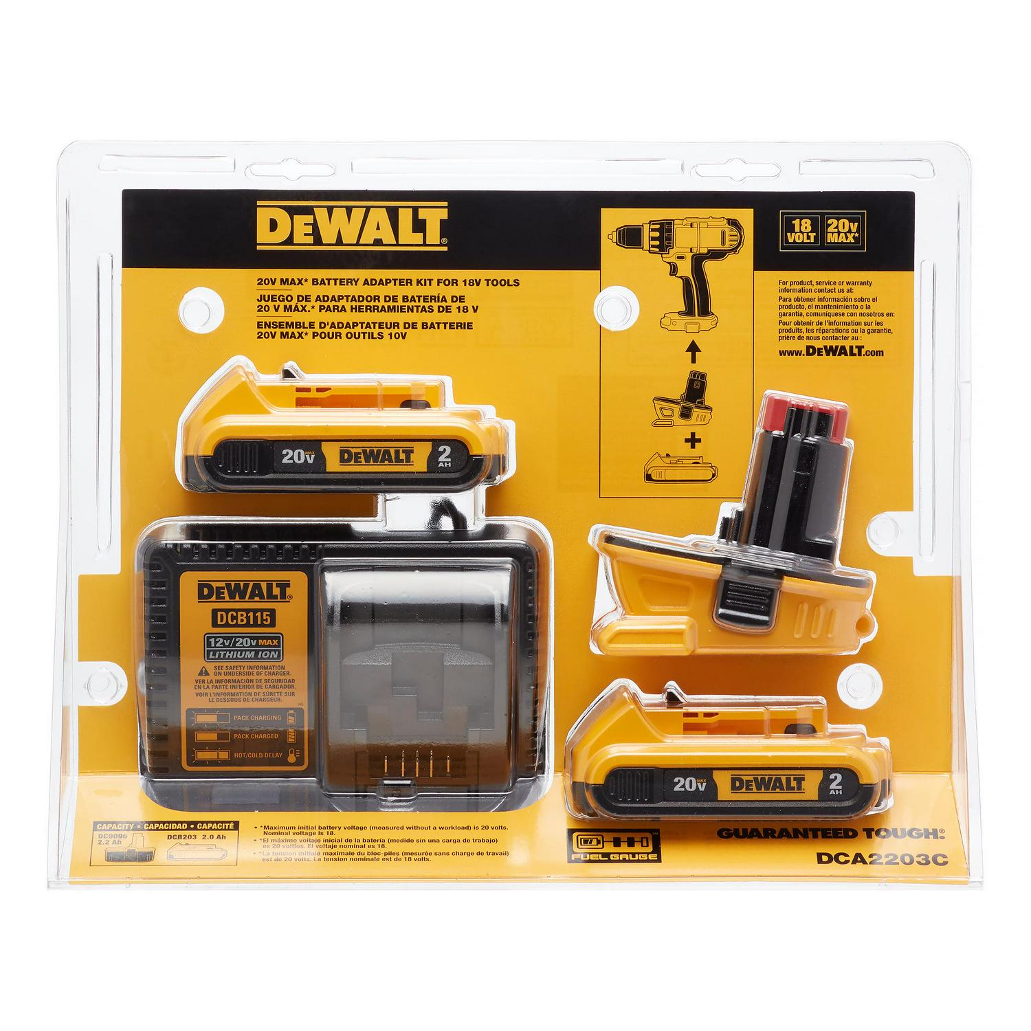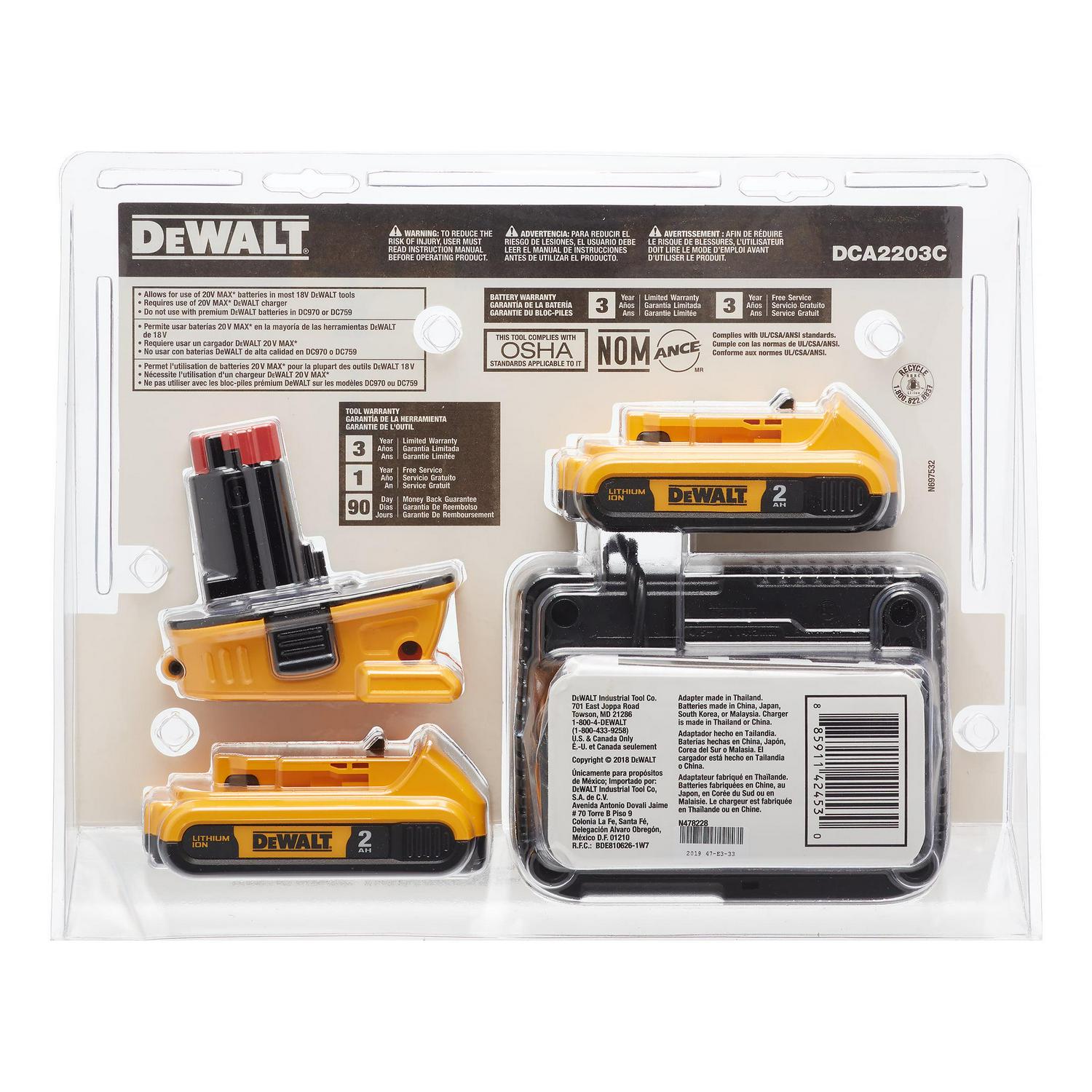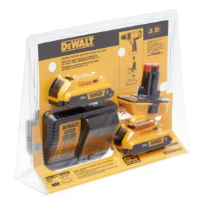 Add versatility to your toolbox with the 20V MAX* to 18V battery adapter kit. This adapter allows you to use select DeWalt 20V MAX* lithium-ion slide pack batteries with DeWalt 18V power tools. The adapter requires the use the 20V MAX* chargers, won’t fit in 18V chargers, and won’t work with 20V/60V FLEXVOLT batteries. Do not use with premium batteries in 18V compact drills. Included in the box is the 18V to 20V MAX* adapter, two DCB203 20V MAX* XR lithium-ion batteries (2.0Ah), and the 12V/20V MAX* charger.