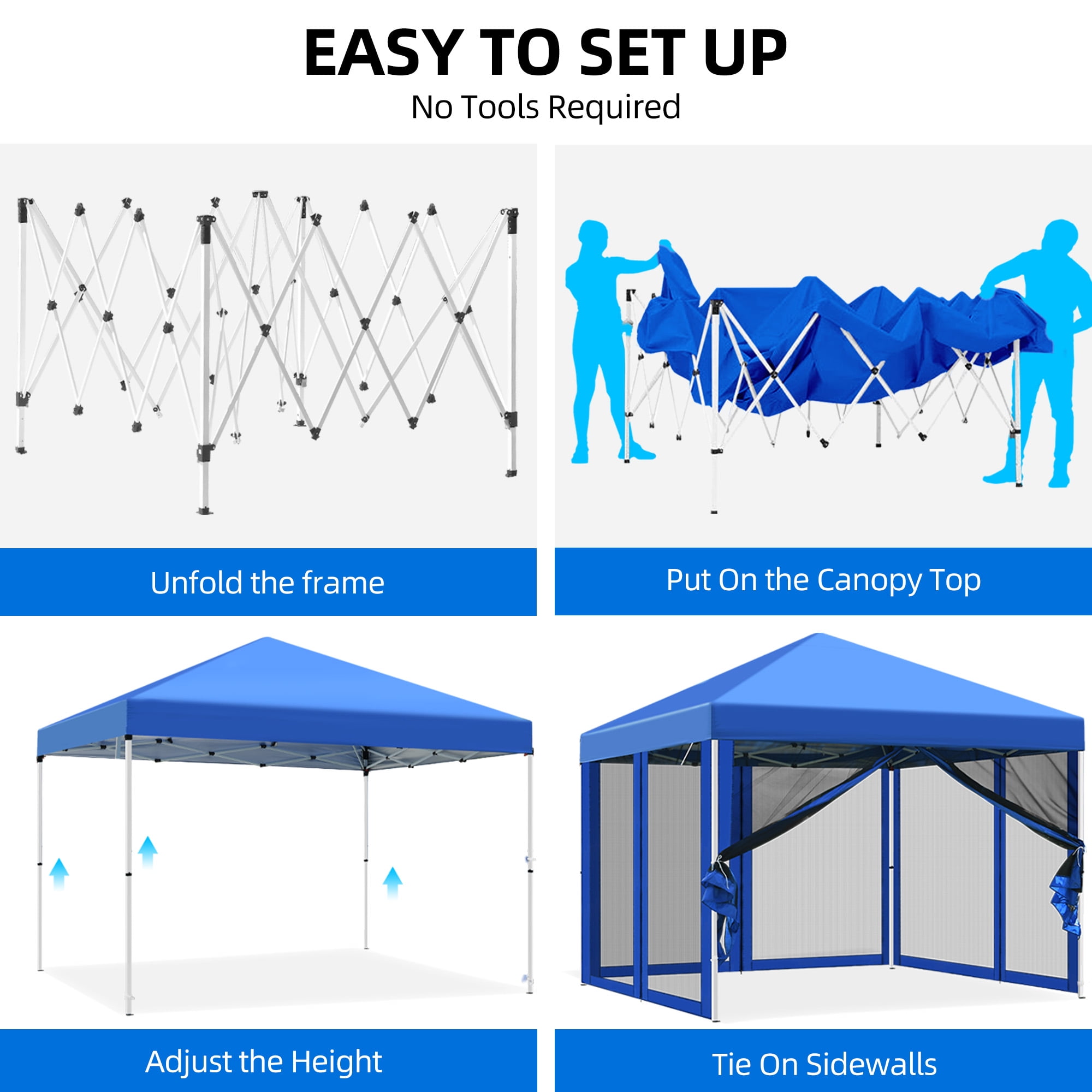 - Pop-Up Canopy Tent Dimension: 120″L x 120″W x 105.5″H