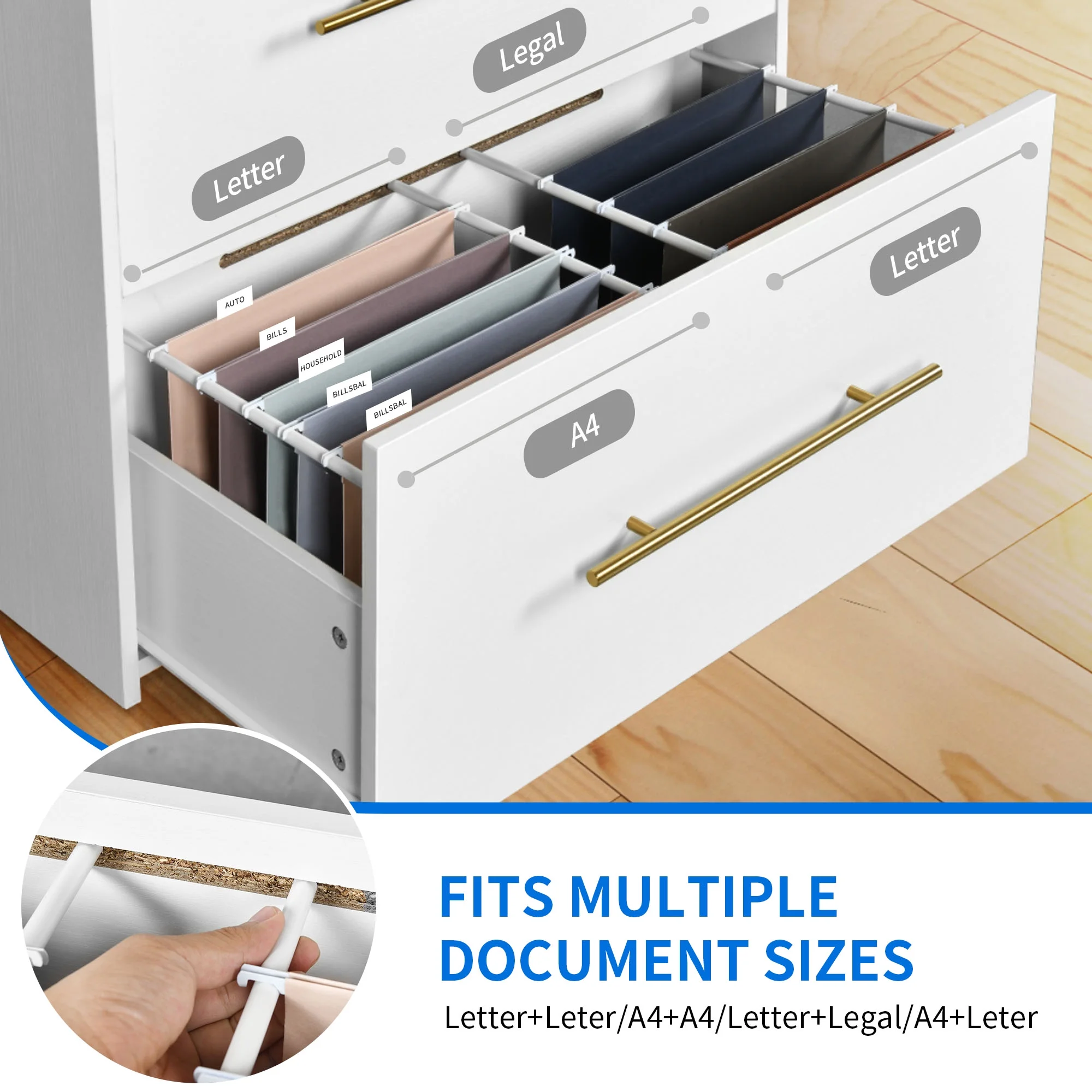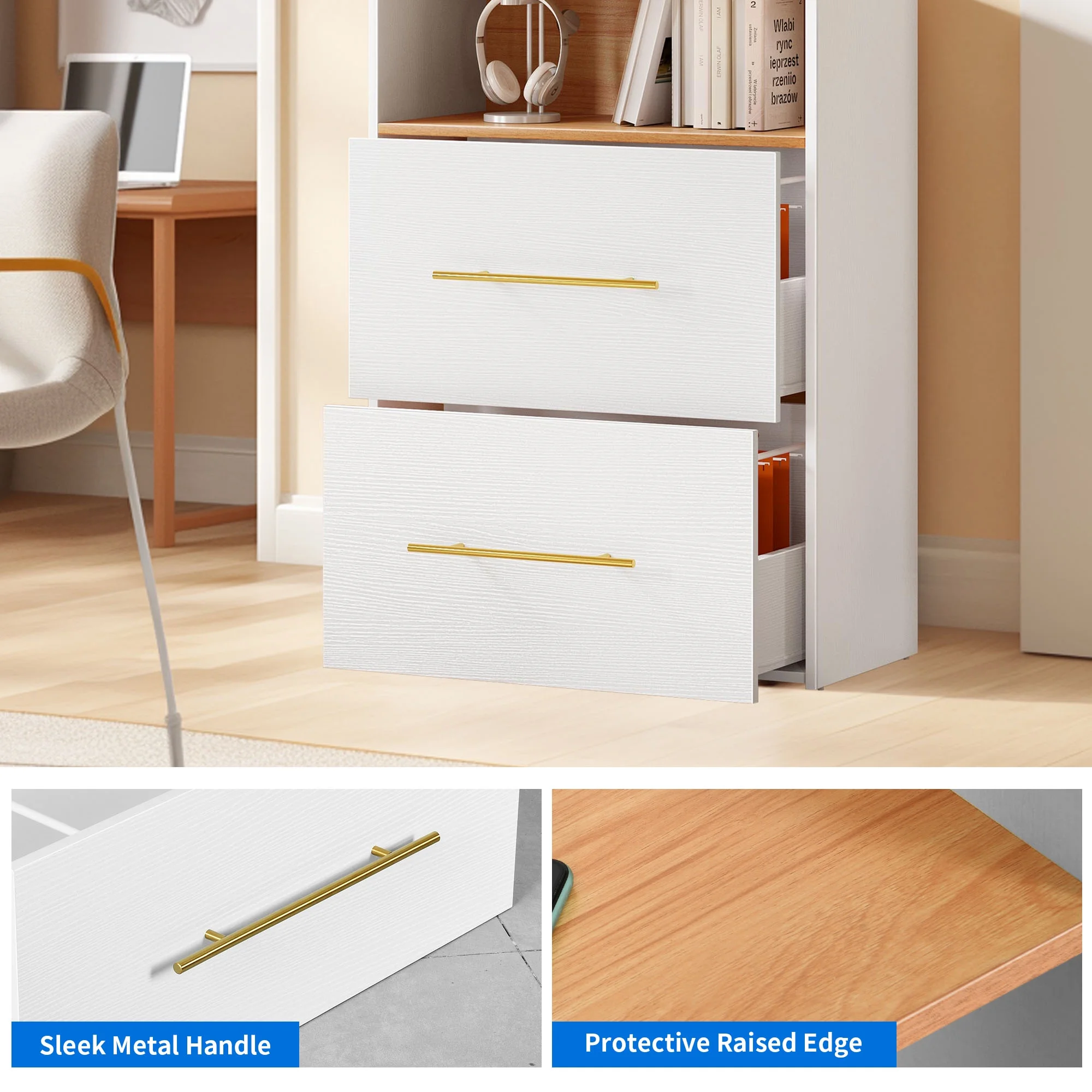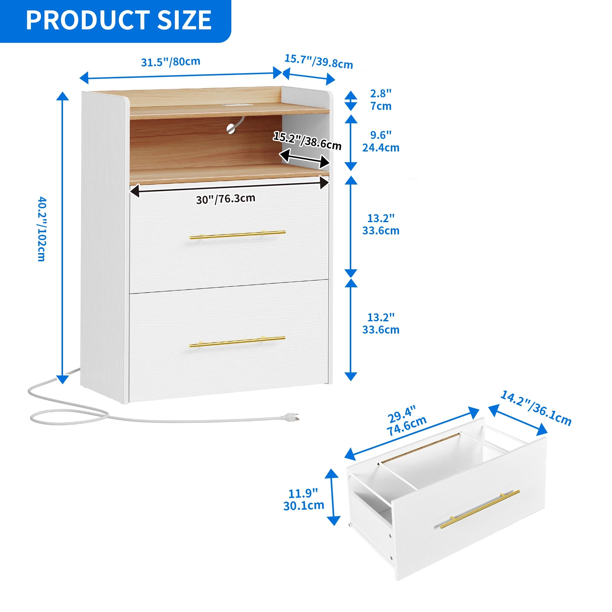 STREAMLINED CHARGING: 2 UL-Listed outlets, 2 USB ports, and a 6.5-foot power cord are designed for effortless device charging while you work or study. Conveniently charge your printer, lamp, smartphone, tablet, and laptop. FILE MANAGEMENT SIMPLIFIED: Two lateral drawers with adjustable hanging bars offer flexible file storage solutions (letter+legal, A4+legal, A4+letter, letter+letter, A4+A4), ensuring organized and easily accessible files. DOUBLES AS NIGHTSTAND: Our 2-drawer cabinet is spacious and adaptable for various bedroom essentials, such as books, toys, cosmetics, clothing, or snacks, keeping them orderly and within reach. SEAMLESS ACCESS: You can get your stuff quickly and easily with drawers that move smoothly on strong ball-bearing slides. Plus, modern metallic handles look great and make it even easier to get to your stuff. RELIABLE & STYLISH: Made from tough P2 wooden board, this cabinet is capable of supporting up to 110lbs. It’s got buckles on the back for extra security and stability, and it’s got a slick white design that exudes a modern and sophisticated vibe.