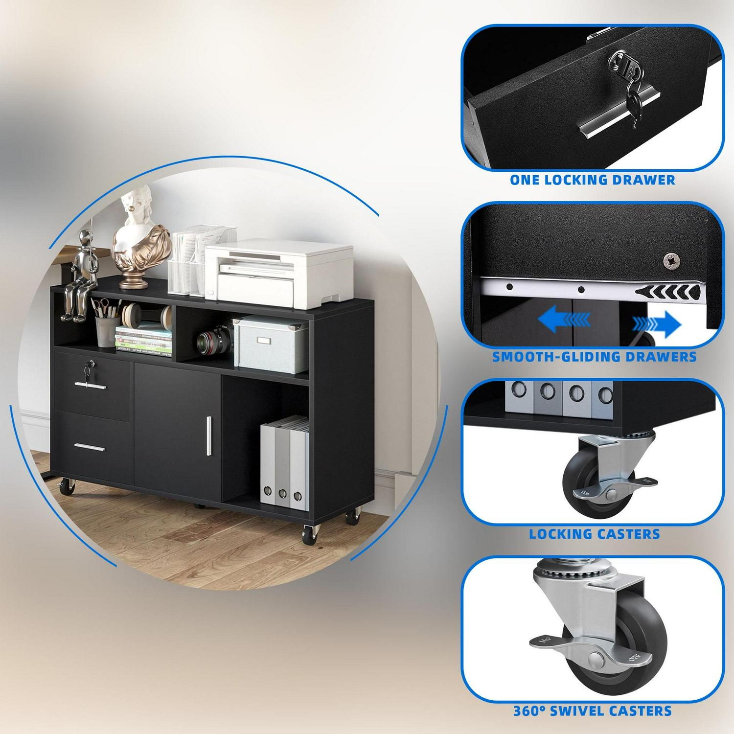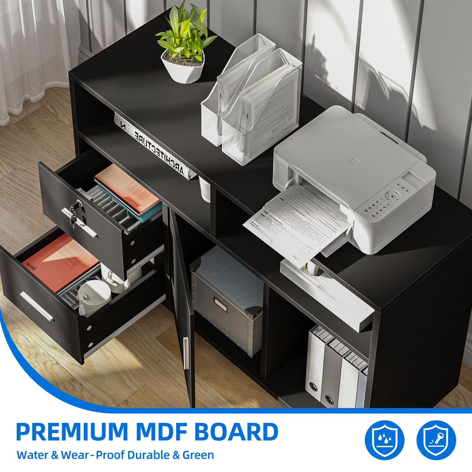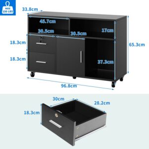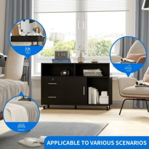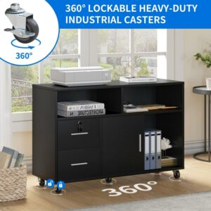 Dextrus 2 Drawer Wood File Cabinet, Mobile Lateral Filing Cabinet with Lock, Printer Stand with Open Storage Shelves for Home Office, Drawers Without Hanging Bars, Black