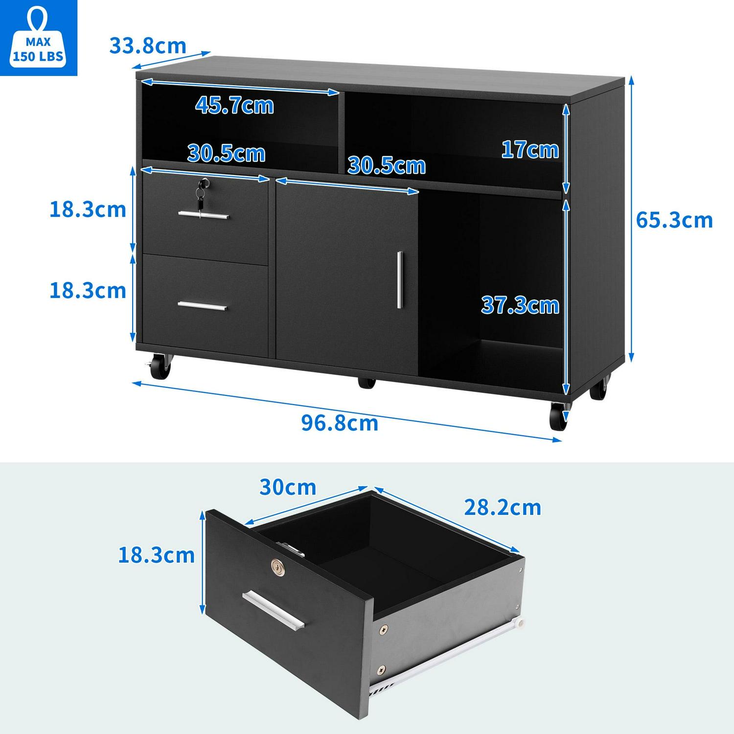 Dextrus 2-drawer vertical filing cabinet is great for holding your computer, laptop, printer, phone, and more. The sleek look complements any modern office. Complete with open storage spaces and file drawers, this filing cabinet is designed to organize office machinery, paper, files, and supplies. It can be placed next to or under a desk. The sleek and modern aesthetic makes it a fantastic fit for any office or home. The cabinet features a desktop for the printer and two top shelves and drawers to store your files and documents. The bottom cabinet and shelf provide additional space for registers and large-sized folders. Constructed using 0.63″ thick PB Panels that can hold up to 100 lbs in total. This cabinet is a sturdy place for your printer and scanner, etc. It comes with 5 heavy-duty casters (2 are lockable) so you can easily move it around without damaging the floor.