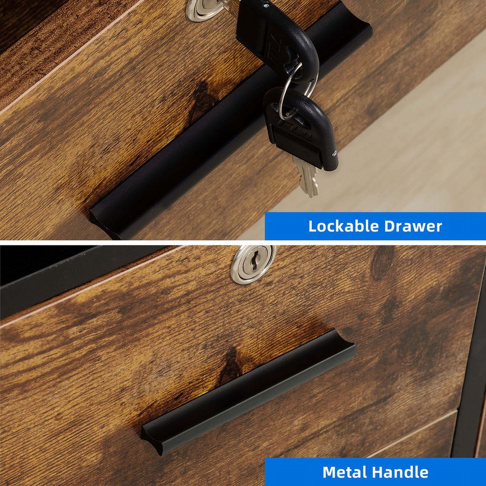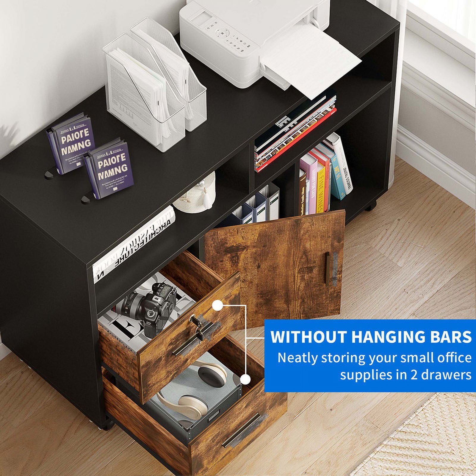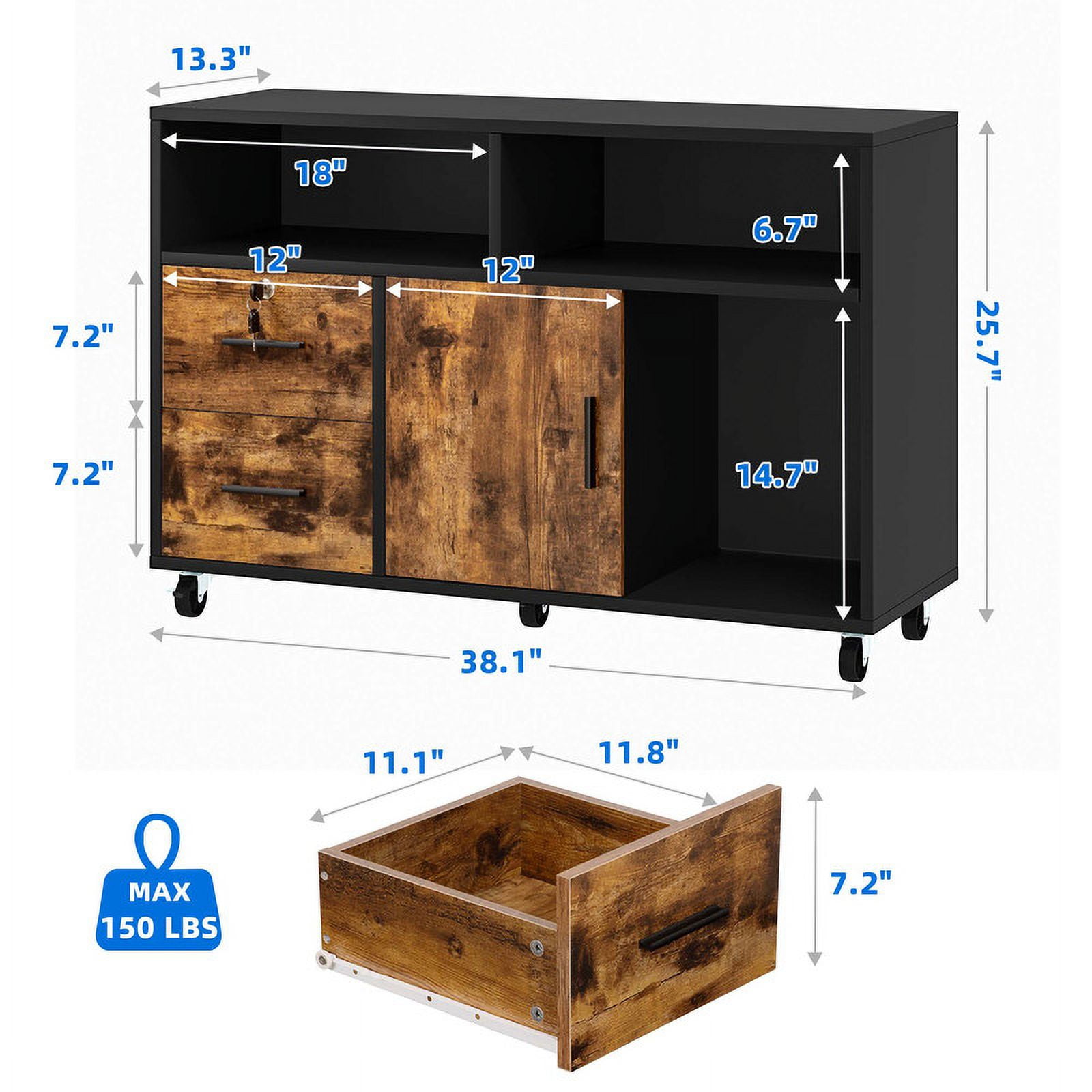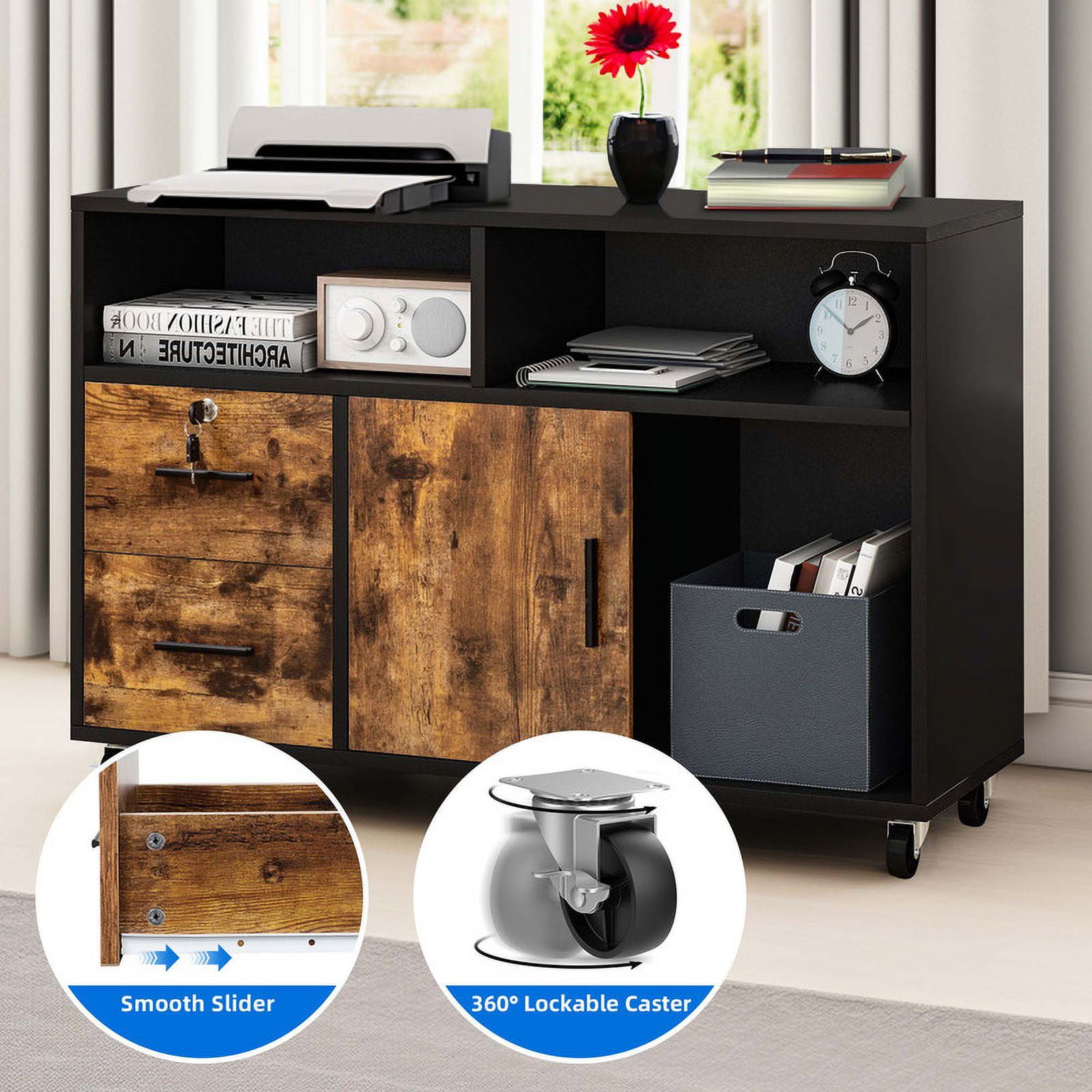 Dextrus 2 Drawer Wood File Cabinet, Mobile Lateral Filing Cabinet with Lock, Printer Stand with Open Storage Shelves for Home Office,Black & Rustic Brown