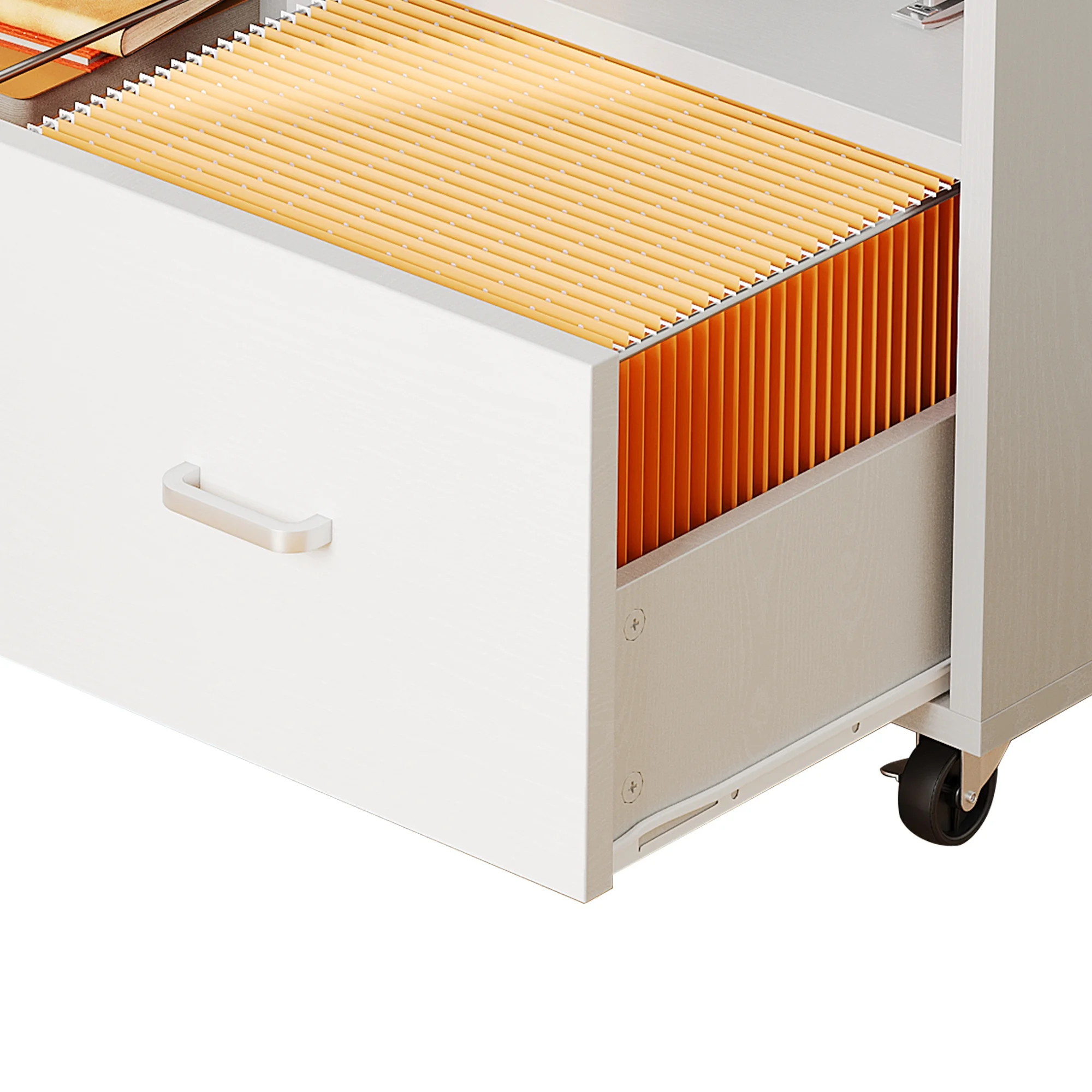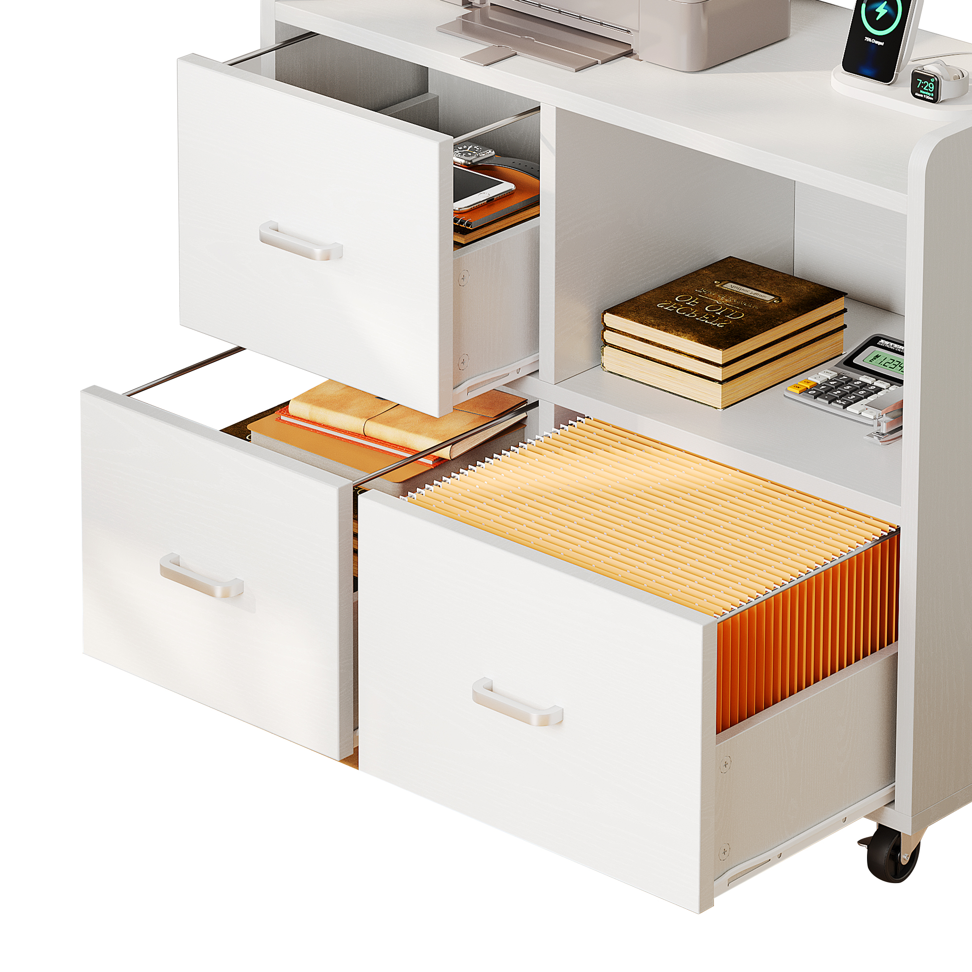 Dextrus 3 Drawer Wood File Cabinet with Charging Station & LED Light, Rolling File Cabinet, White