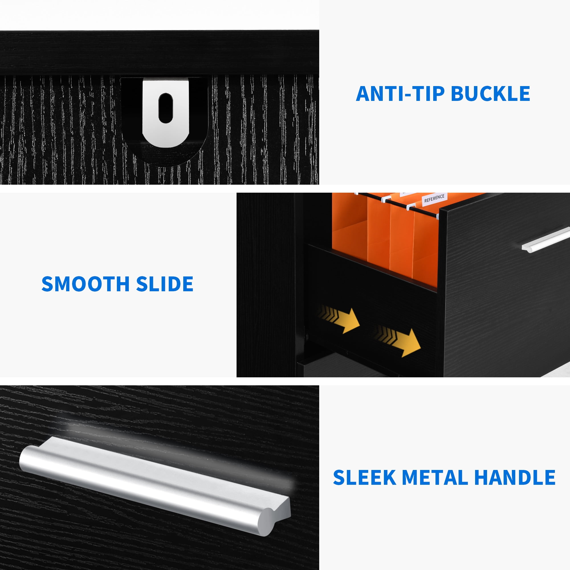 Durable and Sturdy Design: The 4-Drawer File Cabinet features a slender rectangular silhouette with a sleek oak finish. Its solid construction ensures long-lasting durability. Secure and Lockable: The File cabinet has 2 lower drawers that can be locked, providing added security for important documents and items. This feature gives you peace of mind knowing that your belongings are safe. Stable and Reliable: Constructed with thick P2 wooden board, this office storage cabinet is solid and can support up to 110lbs. The anti-tip metal buckle allows you to secure it to the wall, providing added stability and safety. Space-Saving Solution: This office cabinet is designed to save space while offering ample storage. You can place one or two cabinets beside your desk, sofa, or bed, maximizing storage in cramped spaces. Smooth Operation: Each drawer is equipped with two sturdy ball-bearing slides, allowing for smooth opening and closing. This ensures easy access to your files and belongings. The sleek metallic pull handles add a touch of modern appeal.