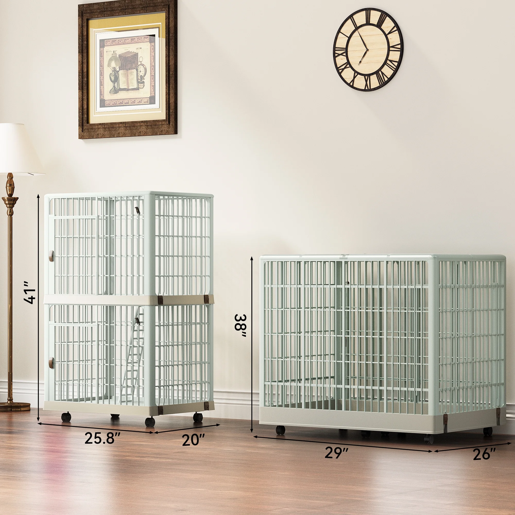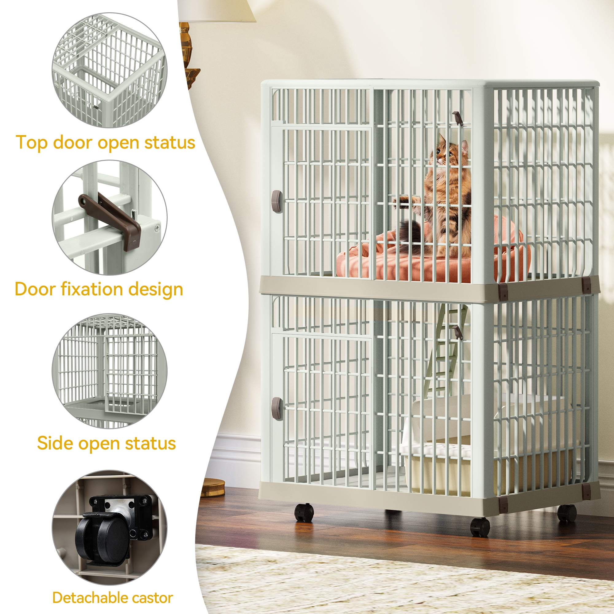 Enhanced Security: This cat cage features a multi-door design with door locks, providing enhanced security for your pets. Durable Resin Construction: Crafted from high-quality resin material, this cage offers superior impact resistance, rust-proofing, and deformation resistance, ensuring long-lasting durability. Convenient Access: The three-door design includes a roof opening and two floor doors, allowing easy entry and exit for your cats. The door handles rotate to open, and a buckle ensures secure closure after opening. Comfortable and Easy to Clean: Unlike traditional iron cages, this cat crate has a smooth and comfortable bottom pallet that is easy to clean. Your cats will enjoy a more comfortable living space. Effortless Mobility: Equipped with universal wheels at the bottom, this cat cage can be easily moved for cleaning or relocation. The simple design and soft color add to the overall convenience and aesthetic appeal.