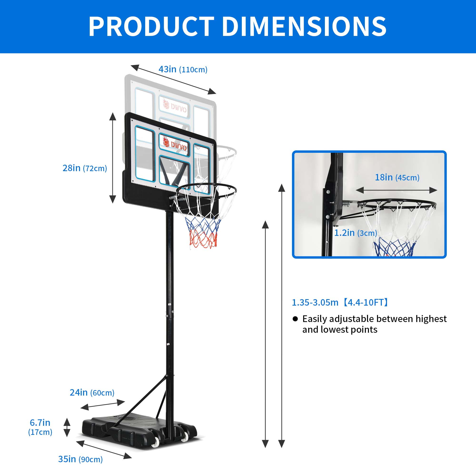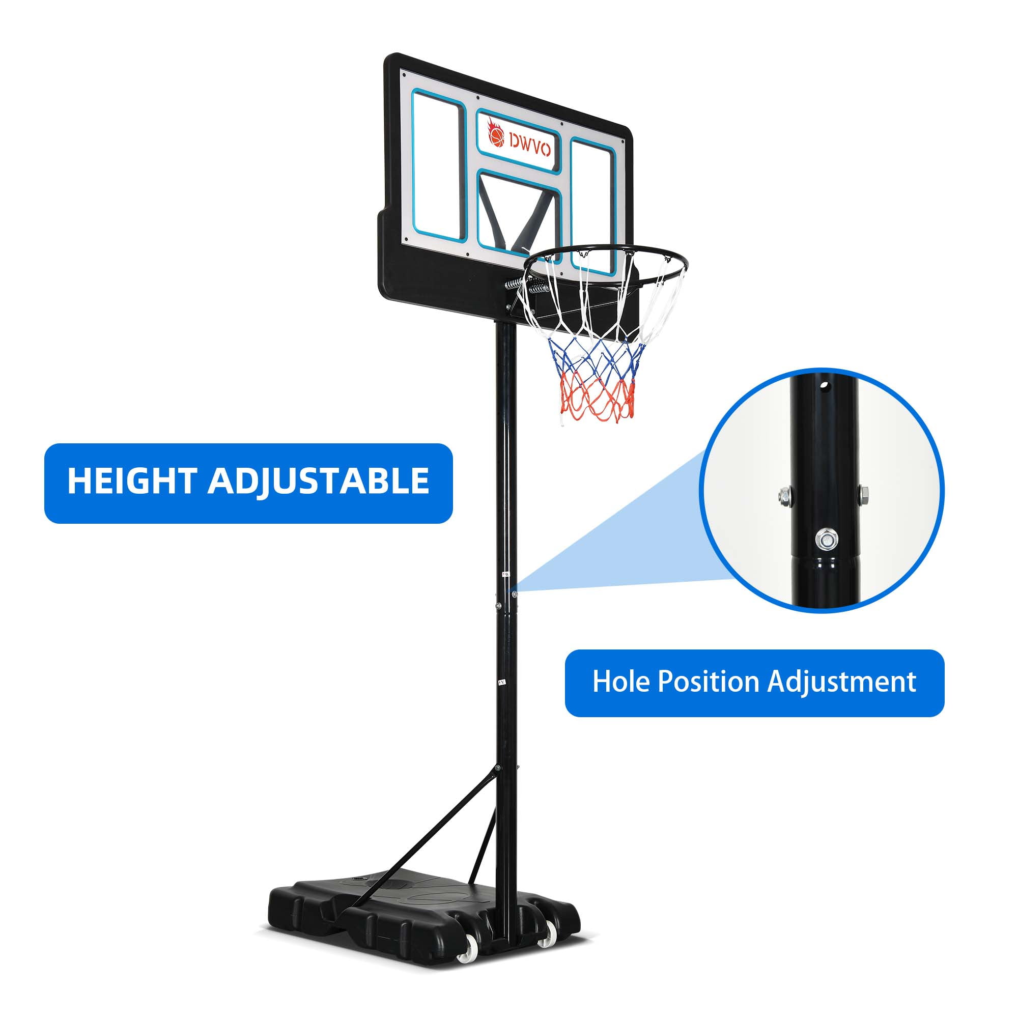 Adjustable Height for All Ages: The portable basketball hoop offers a versatile height range from 4.4 feet to 10 feet, adjustable using a telescopic knob. This feature caters to children, teenagers, and adults, providing an inclusive playing experience for individuals of all ages and skill levels. Portability and Convenience: Designed with built-in wheels, the portable basketball hoop allows for easy transportation to any desired location, whether it be indoors or outdoors. This convenient feature enables users to set up the hoop in various environments, enhancing the flexibility and accessibility of the playing experience. Collision-Resistant Frame and Stable Support: Constructed from high-density premium PET material, the basketball hoop features a triangular support frame with locking screws at the base, ensuring stability and preventing wobbling during gameplay. The collision-resistant frame design enhances durability, making the hoop resilient against impacts, including long-range elastic forces, for a reliable and sturdy structure. Durable PE Base for Enhanced Stability: The oversized base of the basketball hoop is crafted from high-quality PE material and features a hollow design for convenient movement. Users can fill the base with water or sand to increase its gravitational pull and stability. Sand is recommended for filling, as it offers better stability compared to water, ensuring a secure and steady base for optimal gameplay. Overall Enhanced Playing Experience: With its adjustable height settings, portable design with built-in wheels, collision-resistant frame, and durable PE base for stability, this portable basketball hoop offers an enhanced playing experience for users of all ages.
