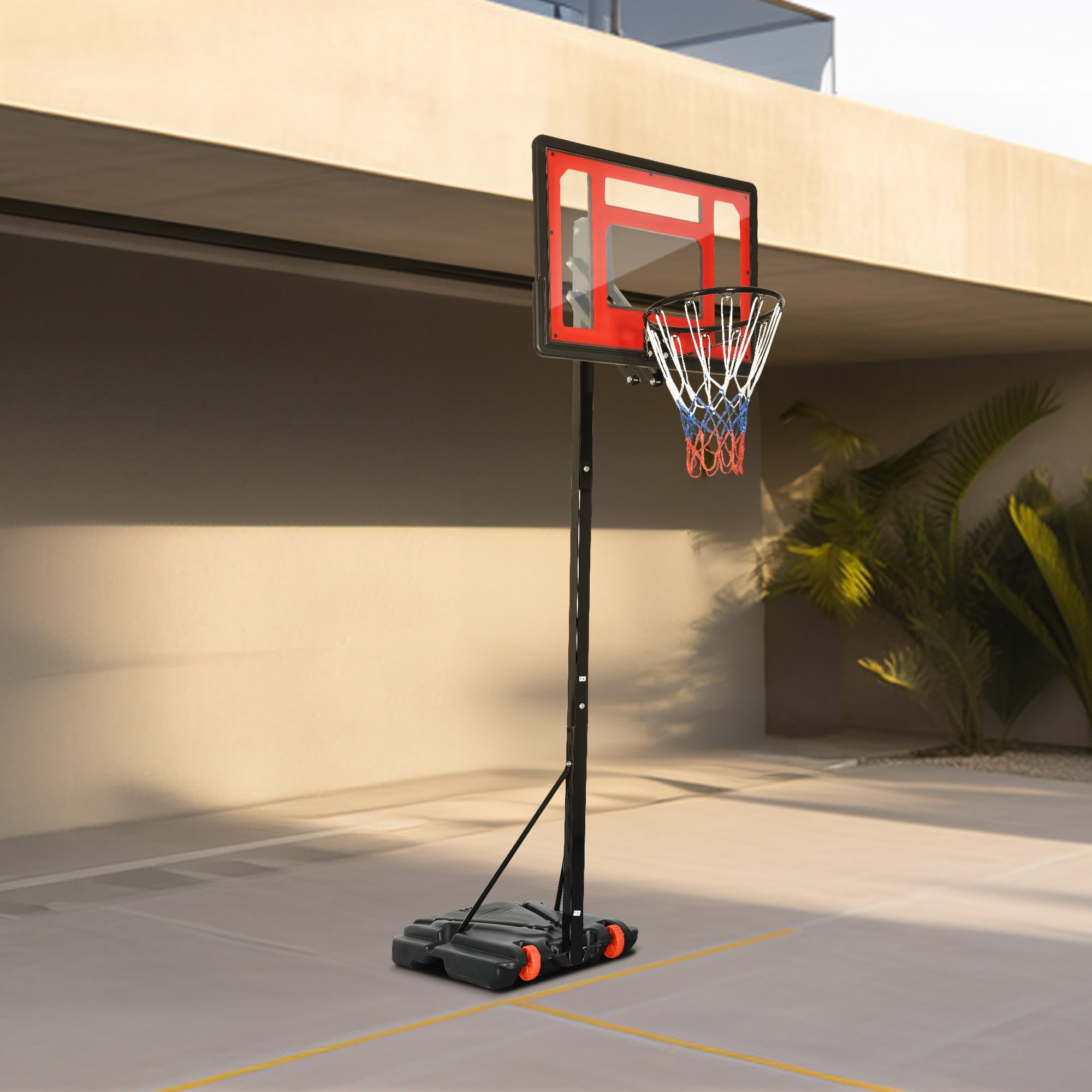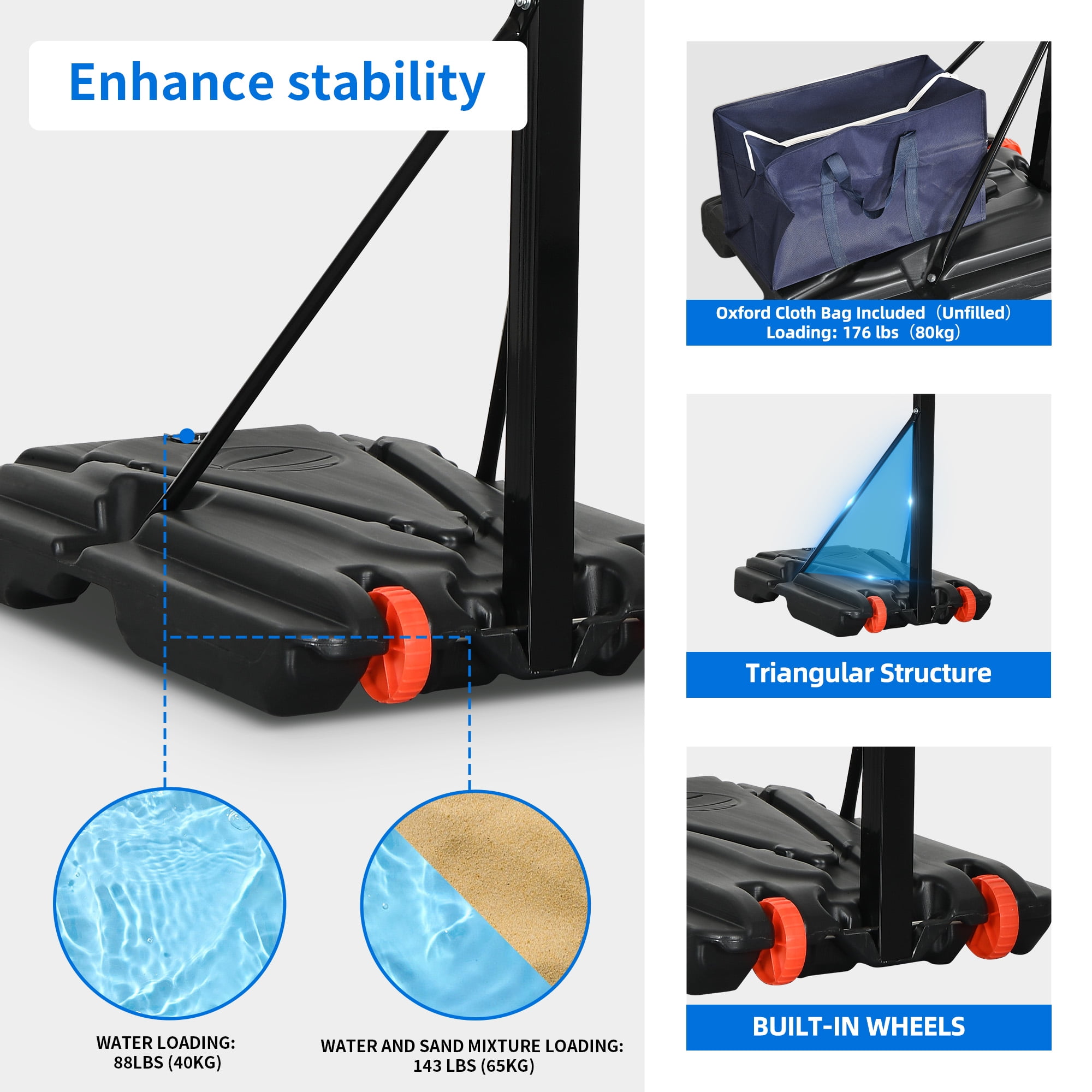 - 【Stable Structure】– The main pole of the basketball portable hoop is constructed with 50×50mm, 1.4mm thick steel pipes, providing a stable and sturdy structure. The base measures 31×22×6 inches and can be filled with water or sand, reaching a weight of 143 pounds. You can enjoy playing without worrying about the hoop tipping over.