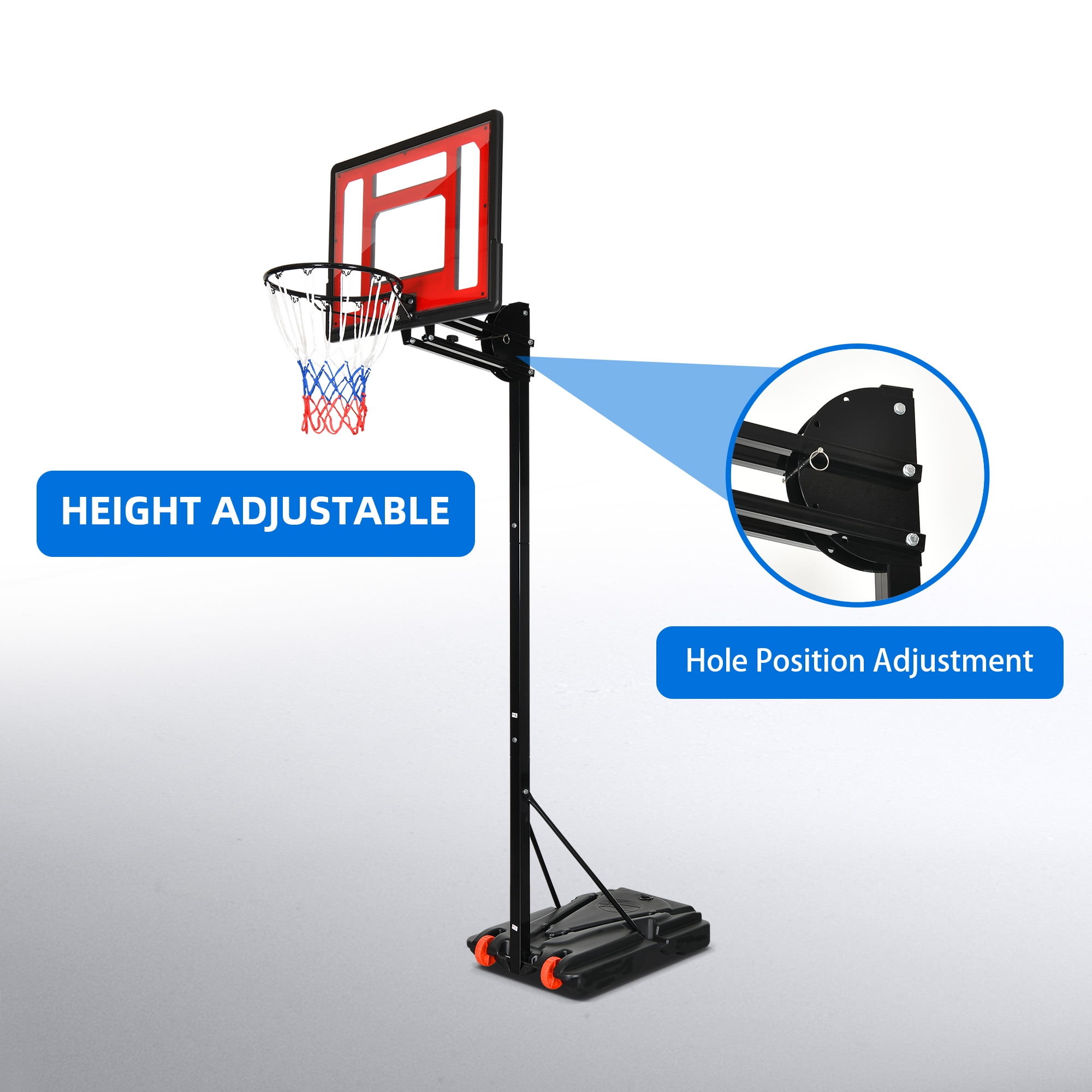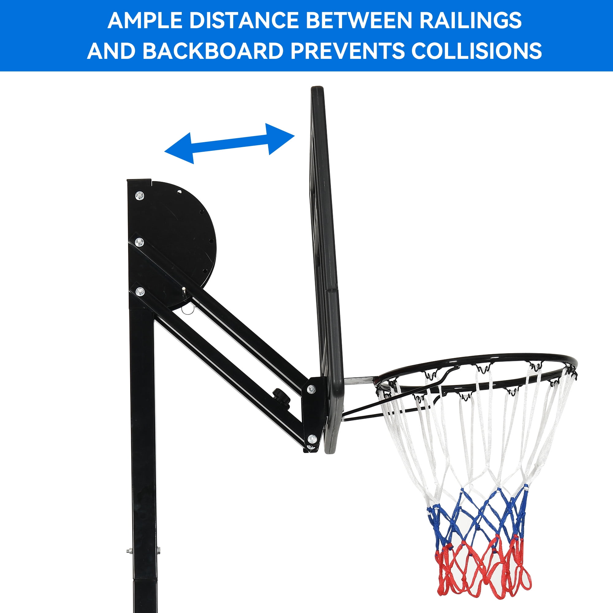 - 【Safty Design】- We has taken into consideration user safety by ensuring there is sufficient distance between the backboard and the main pole. This prevents any potential injuries from accidentally kicking the main pole while jumping up to shoot.
