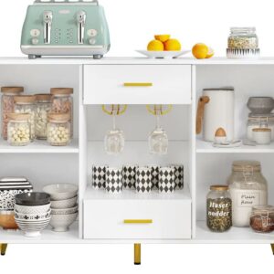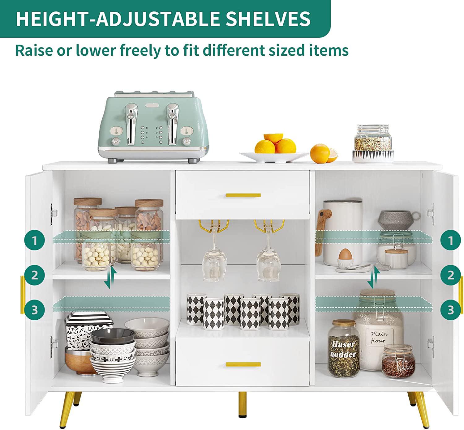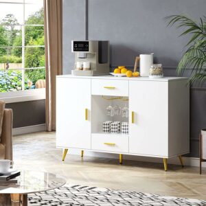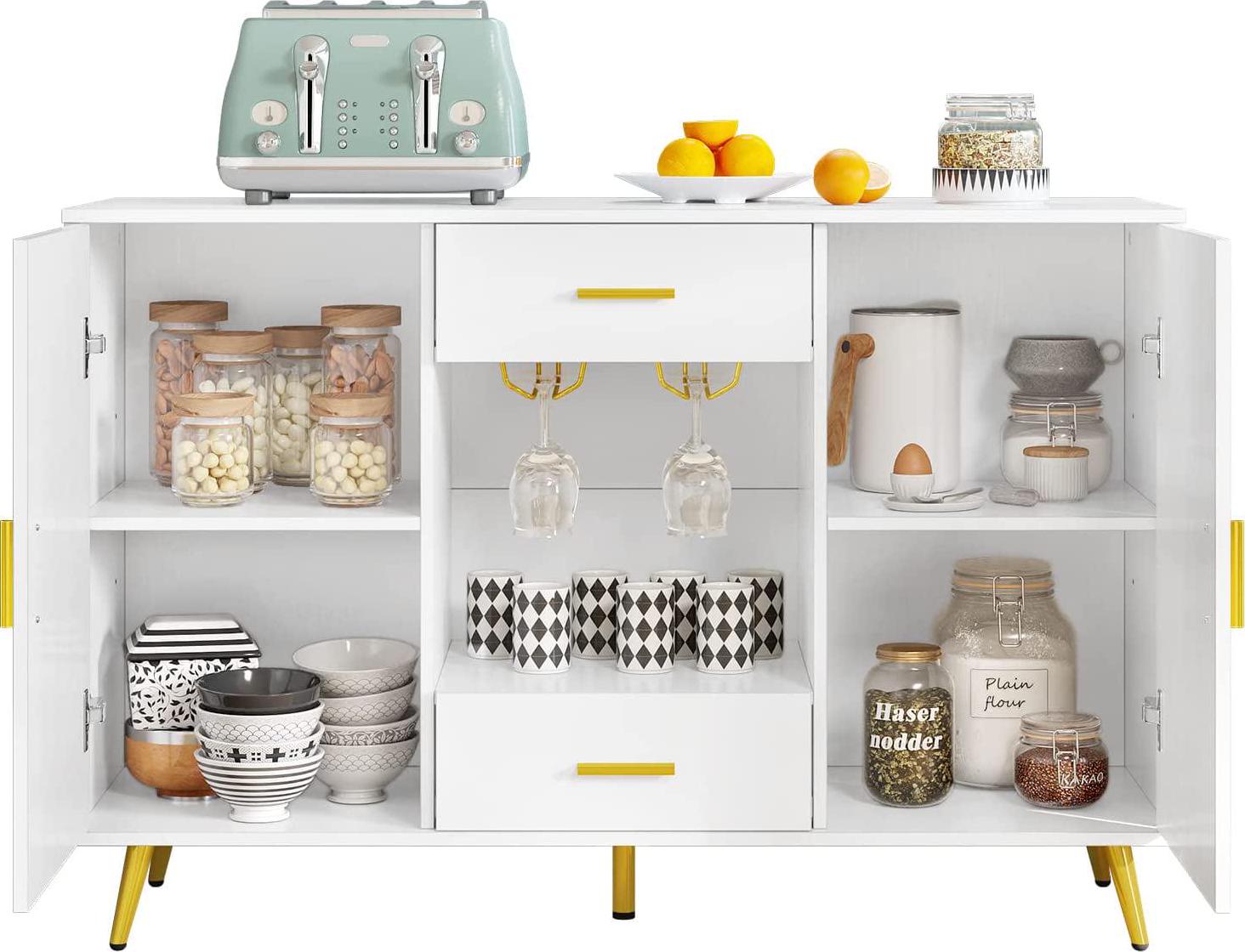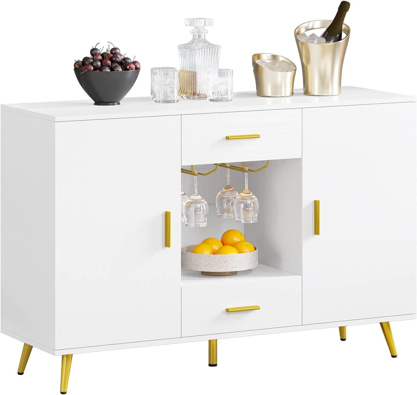 Dextrus Buffet Cabinet, Sideboard and Buffet with Storage, Credenza with Adjustable Shelf, Wine Glass Holder, Drawers for Kitchen, Dining Room , White and Gold