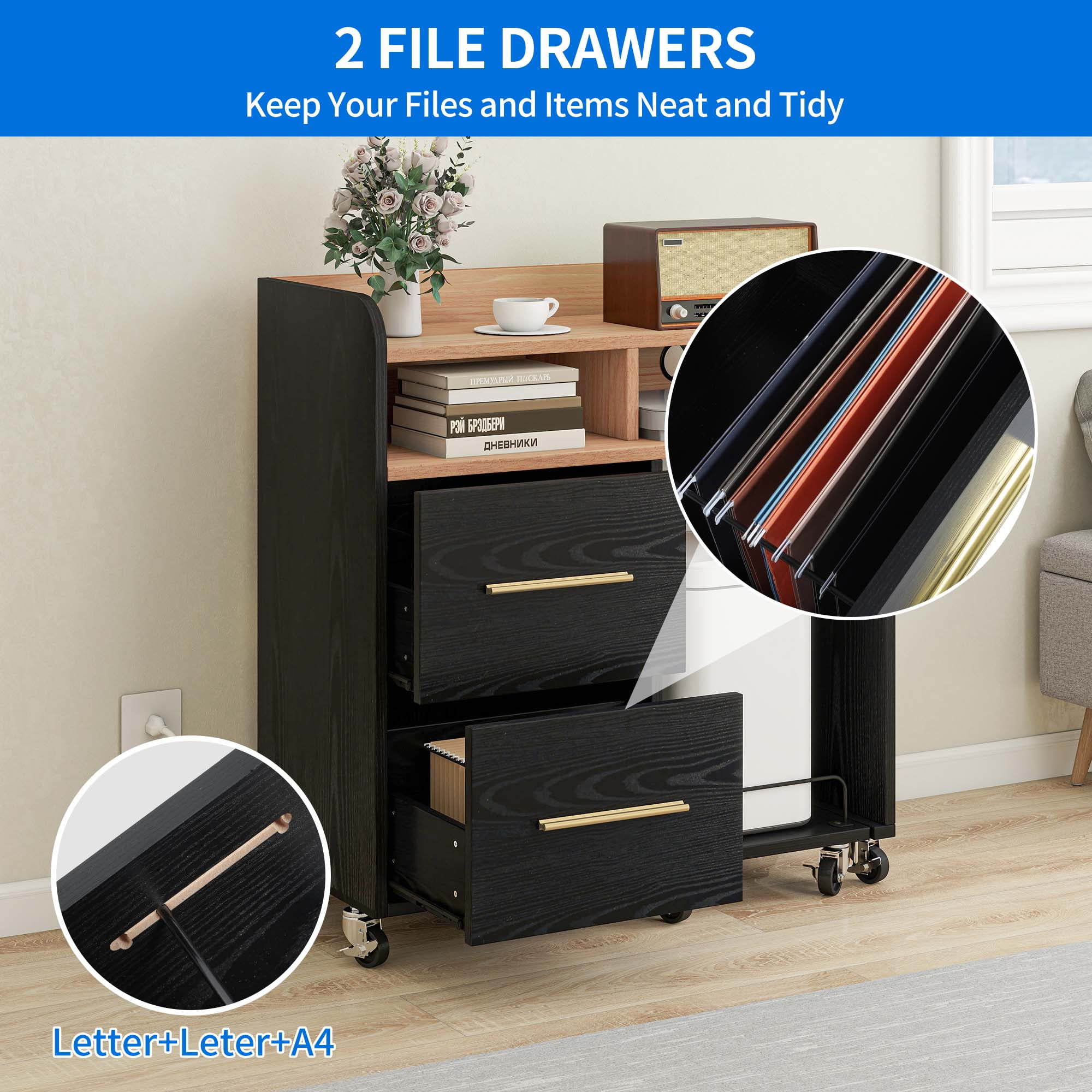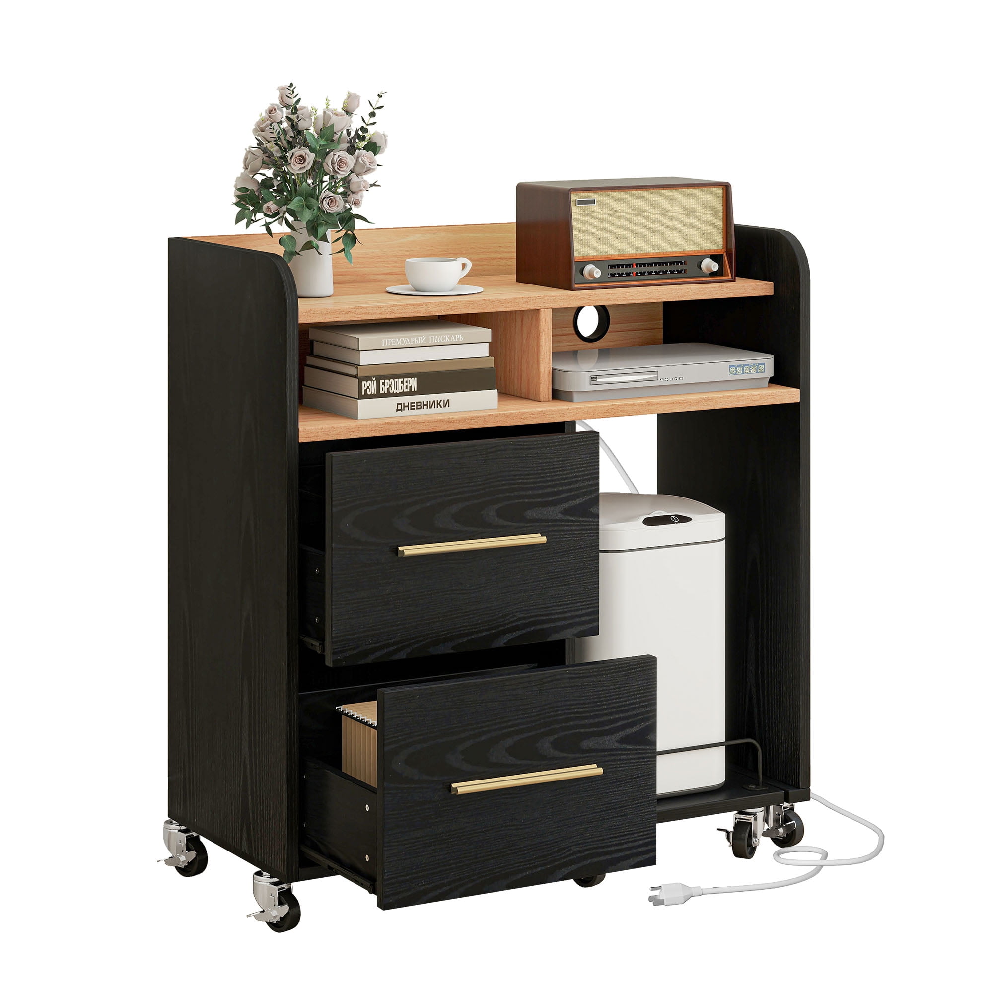 MAKE ORGANIZATION A BREEZE: Equipped with 2 UL-Listed outlets, 2 USB ports, and a generous 6.5-foot power cord, our wooden file cabinet simplifies your workspace. Keep your printer, lamp, phone, iPad, and laptop powered up while you work or study. 2-DRAWER FILING CABINET: Our file cabinet boasts a sleek, rectangular design with a flawless finish. The two drawers feature adjustable hanging bars for file folders and convenient label holders. Ideal for the office, study, bedroom, living room, and more. MULTIPURPOSE OFFICE STORAGE: This file cabinet doubles as a printer stand, printer desk, printer rack, shredder rack, and fax machine stand. It even includes a handy pull-out shelf designed for storing a shredder or computer tower. SMOOTH OPERATION: Thanks to robust ball-bearing slides, our drawers open and close effortlessly, granting you easy access to your essentials. The stylish metallic pull handles lend a contemporary touch to your workspace. ENHANCED DURABILITY AND STABILITY: Crafted from thick P2 wooden board, our office storage cabinet can support up to 110 lbs. The added plastic back buckle ensures both safety and stability. Elevate your organization game!