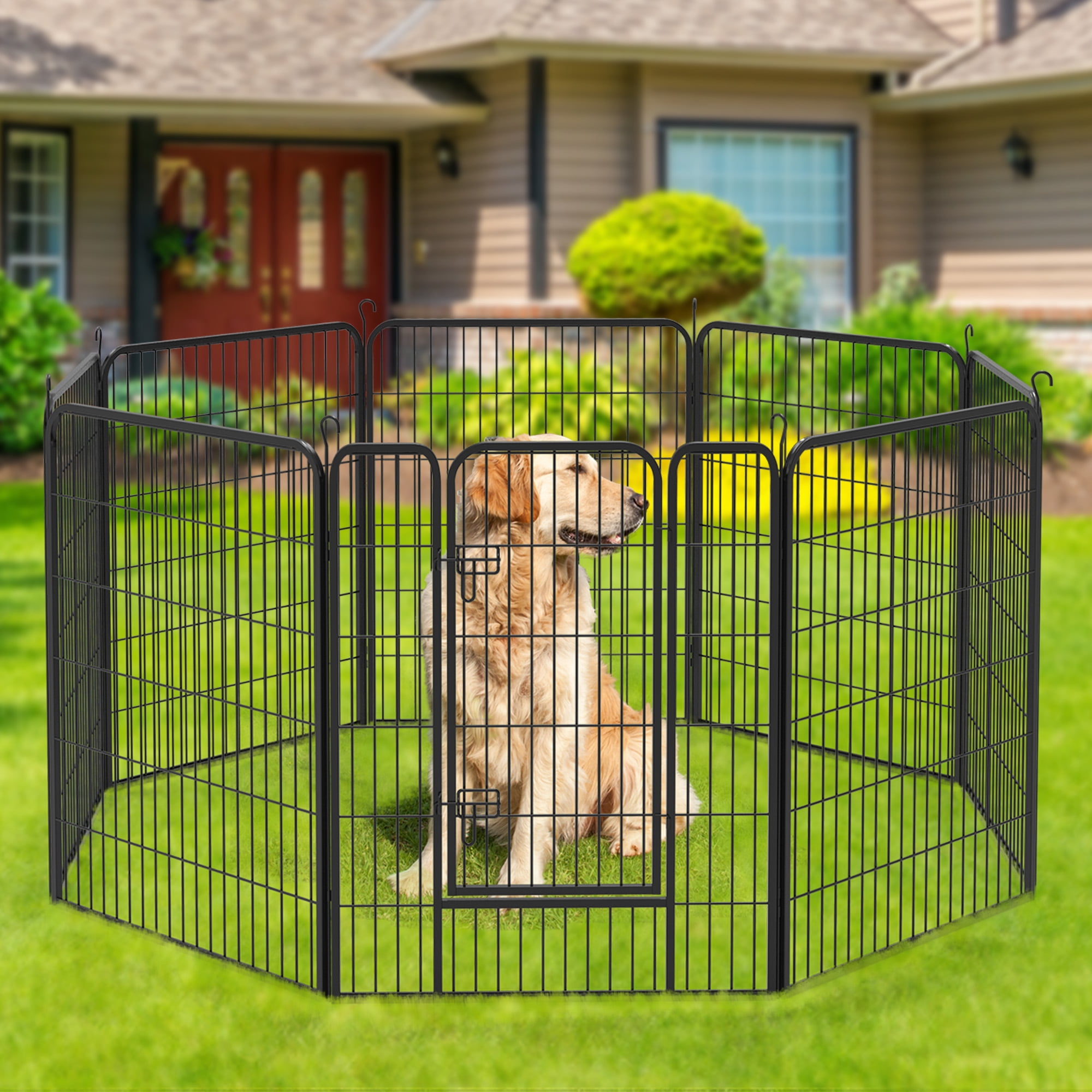 Premium Material: Made from premium metal, this patio fence delivers a smooth touch and solid structure; Antirust spraying process can resist erosion by wind, snow and rain Easy Assembly:The indoor and outdoor dog fence panels can be installed in just minutes; It also can be set up in different shapes based on your needs Spacious Room:An ideal exercise fence, playpen or resting area; it provides ample space for pets to enjoy outdoor exercise in a pet-friendly environment Multiple Applications: It Can be used as decorative garden fences, flower bed fences, animal barrier, outdoor fence for dogs, temporary fence, fence borders, pet fences, dog playpen, courtyard fences, etc. Specifications: Garden Fence Border Size:31.5″x40″ per panel, Package: 7 pcs x decorative fence panel, 1 pcs x gate