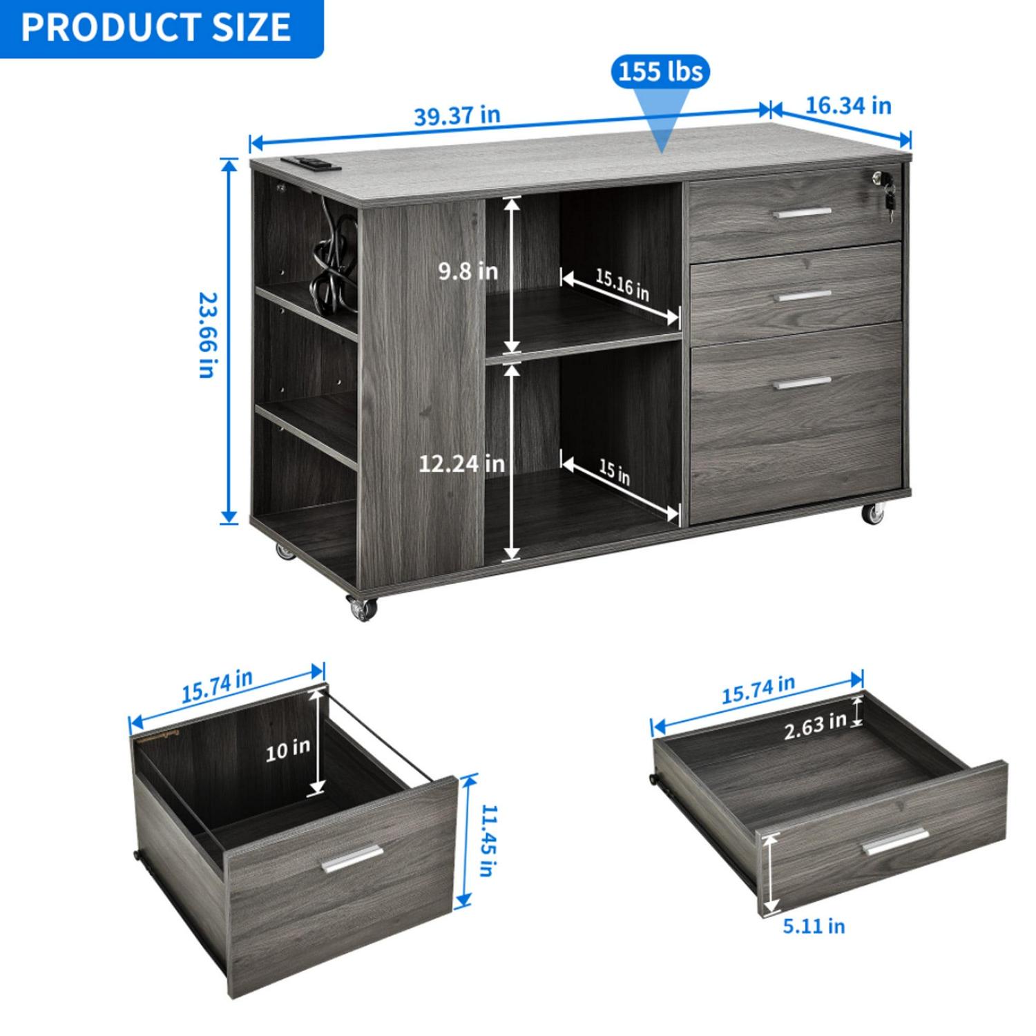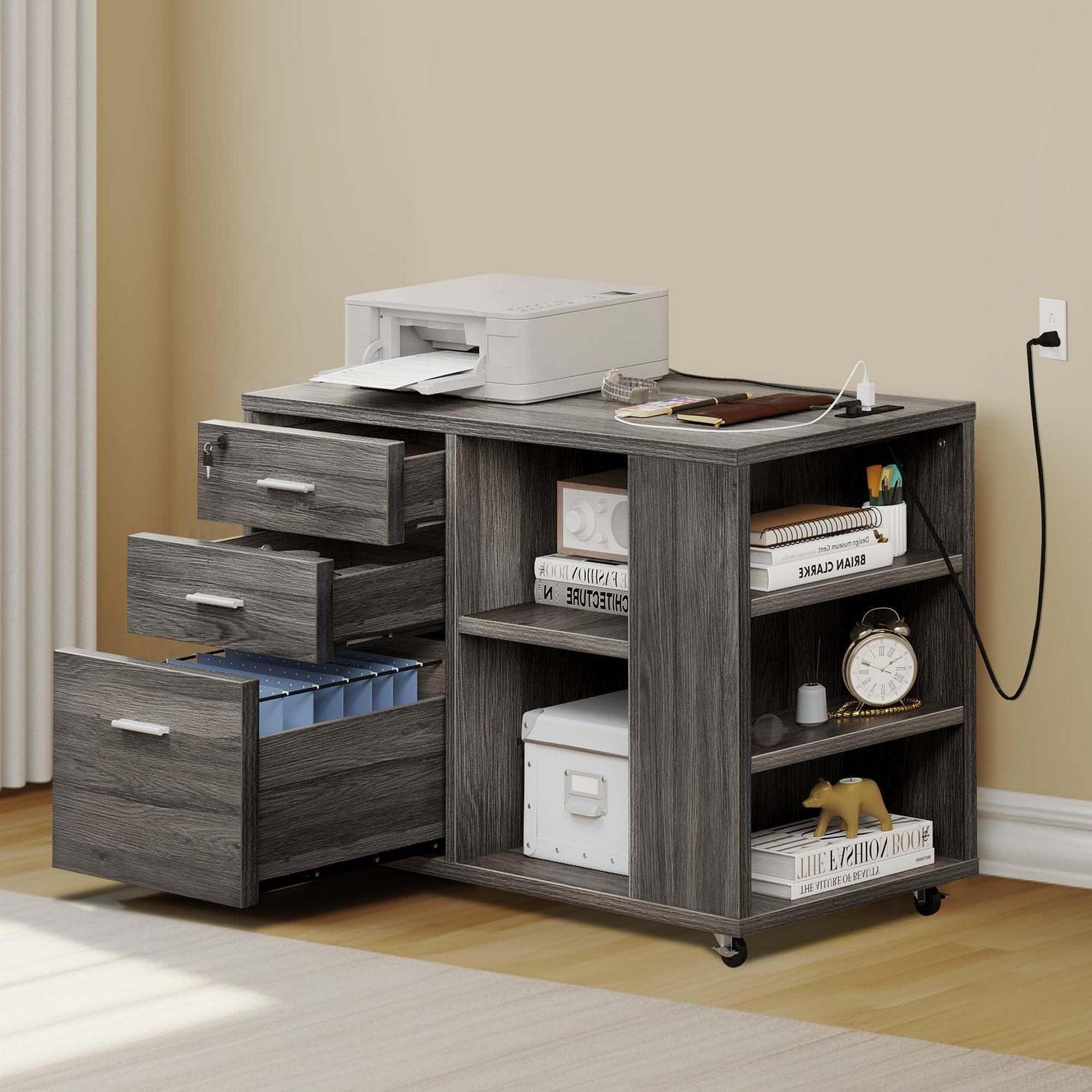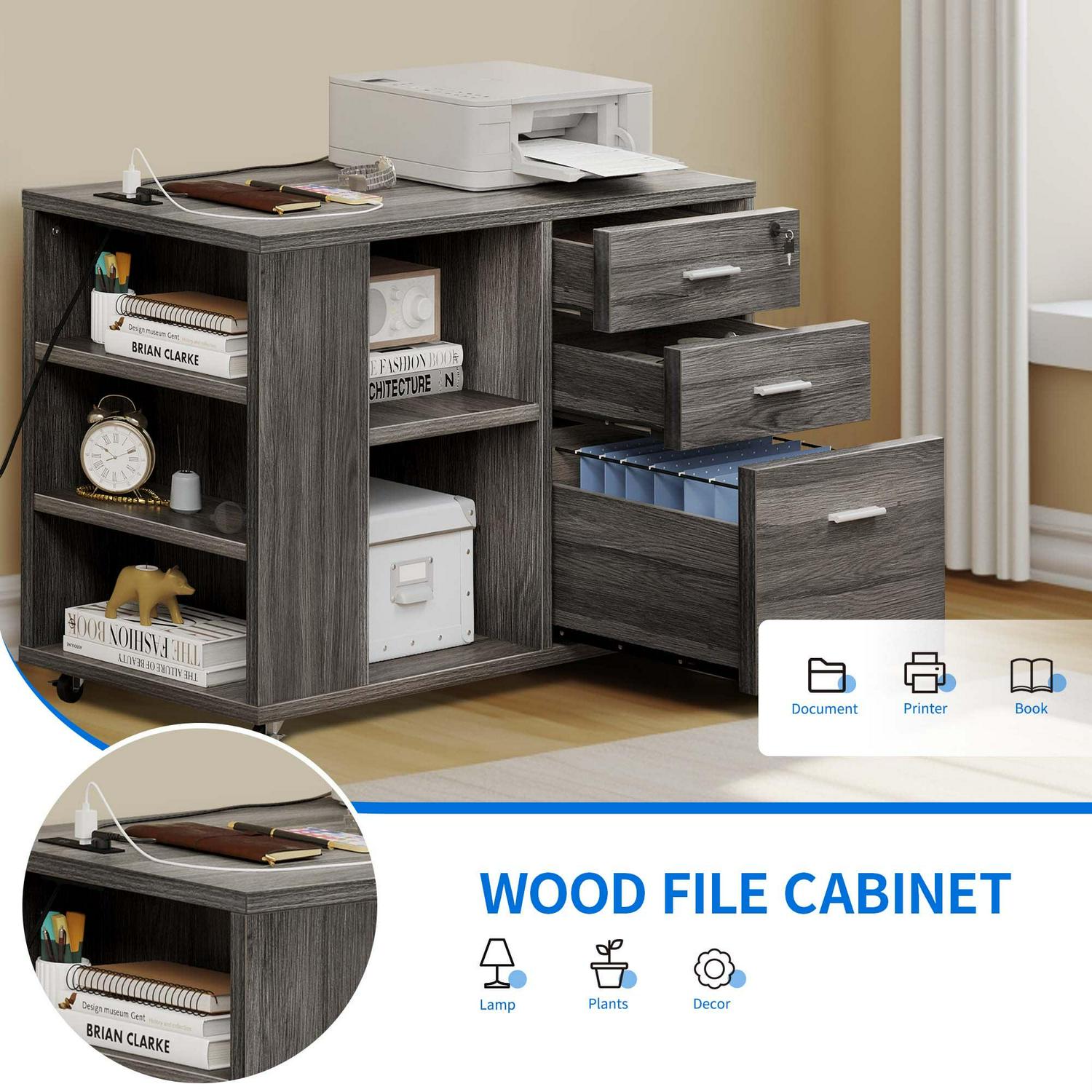 Dextrus Mobile Wood Lateral File Cabinet W/ Charging Station and Lock Printer Stand Fits A4 Letter Legal Size Files