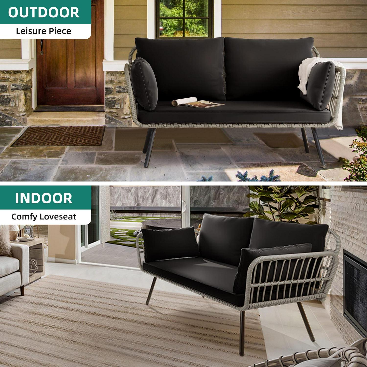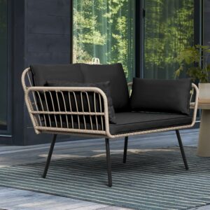 – MODERN LOUNGE SOFA ELEGANCE: The exquisite wicker with black cushions not only adds durability but infuses a touch of trendy mid-century modern style to your outdoor spaces, from your patio and porch to the backyard, balcony, deck, or poolside.