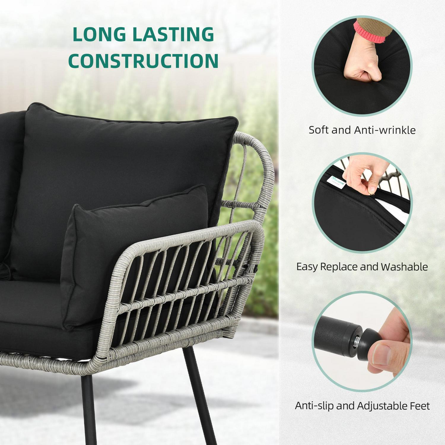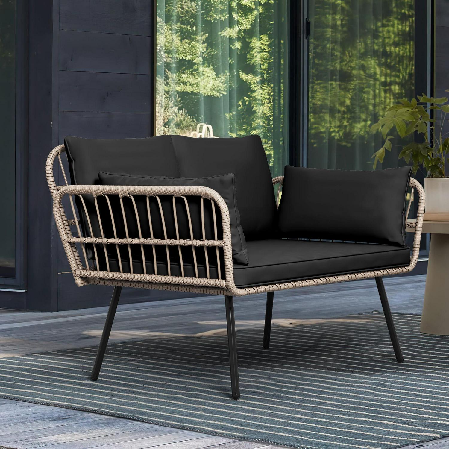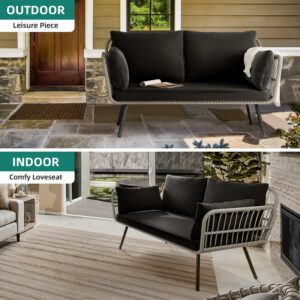 DEXTRUS Patio Loveseat Sofa, All-Weather Wicker Rattan 2 Seater Sofa with Black Cushions and Lumbar Pillows, Outdoor Patio Furniture Set