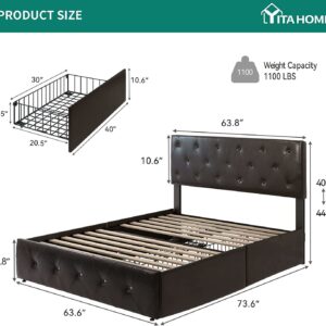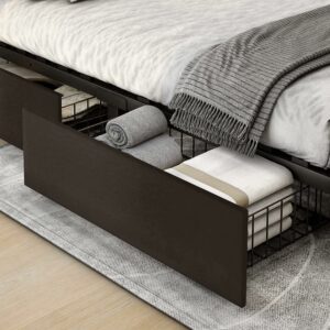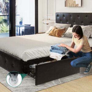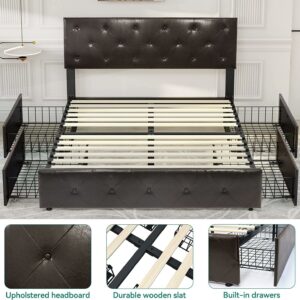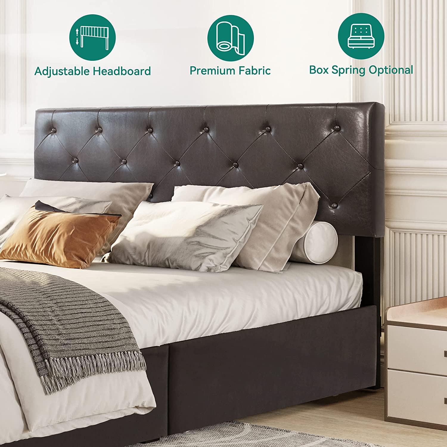 Dextrus Upholstered Platform Bed Frame with 4 Storage Drawers and Adjustable Headboard, Mattress Foundation with Sturdy Wood Slat Support, No Box Spring Needed, Brown (Queen)