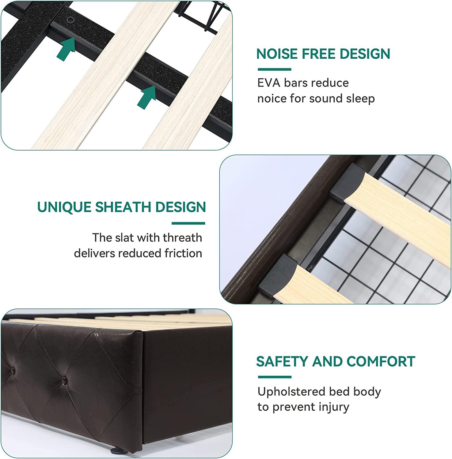 – THOUGHTFUL DETAILS- Silent pads on the metal frame reduce noise to ensure a comfortable sleep. The slat adopts sheath to reduce friction and strengthen firmness, such details adds more comfort and sturdiness for your sleep.