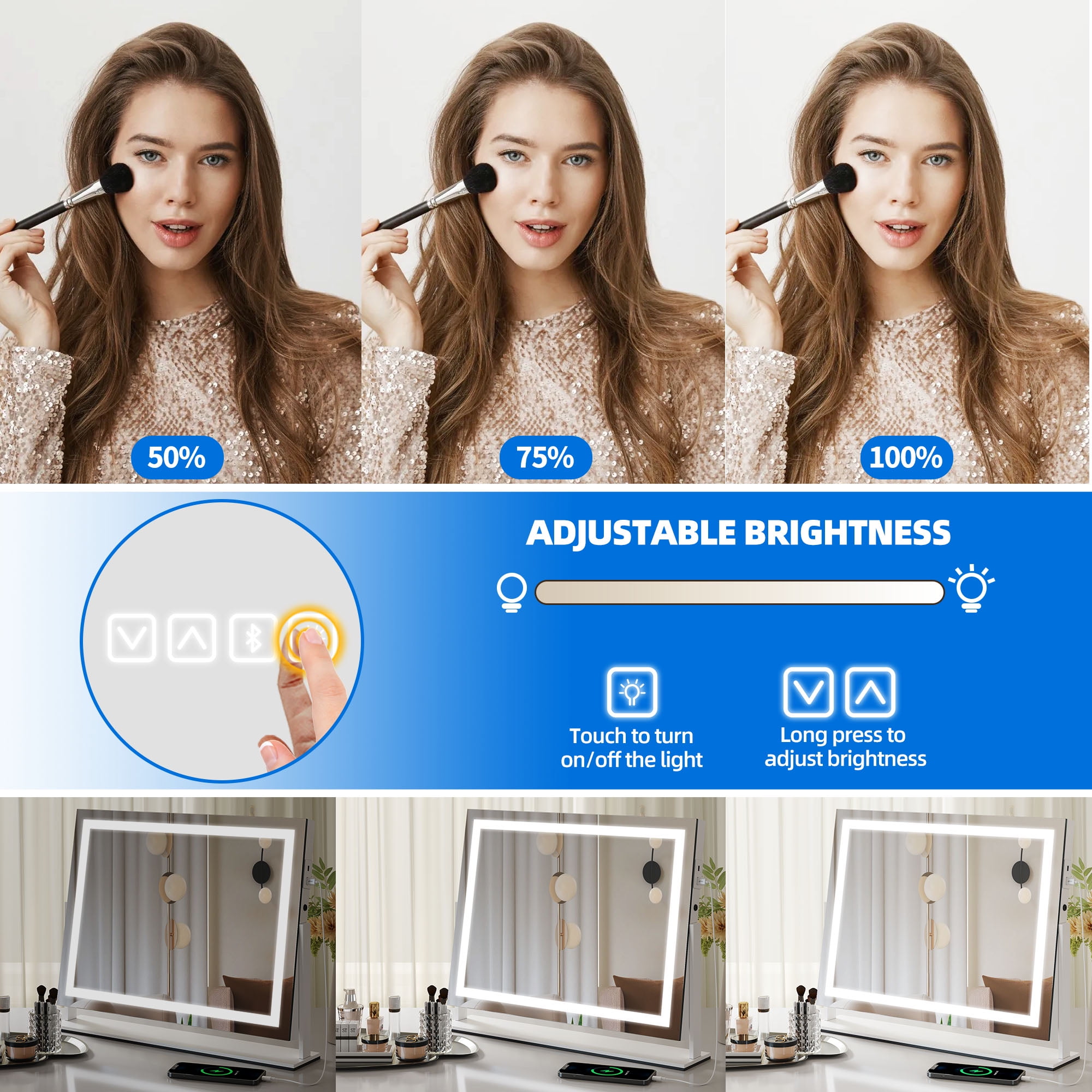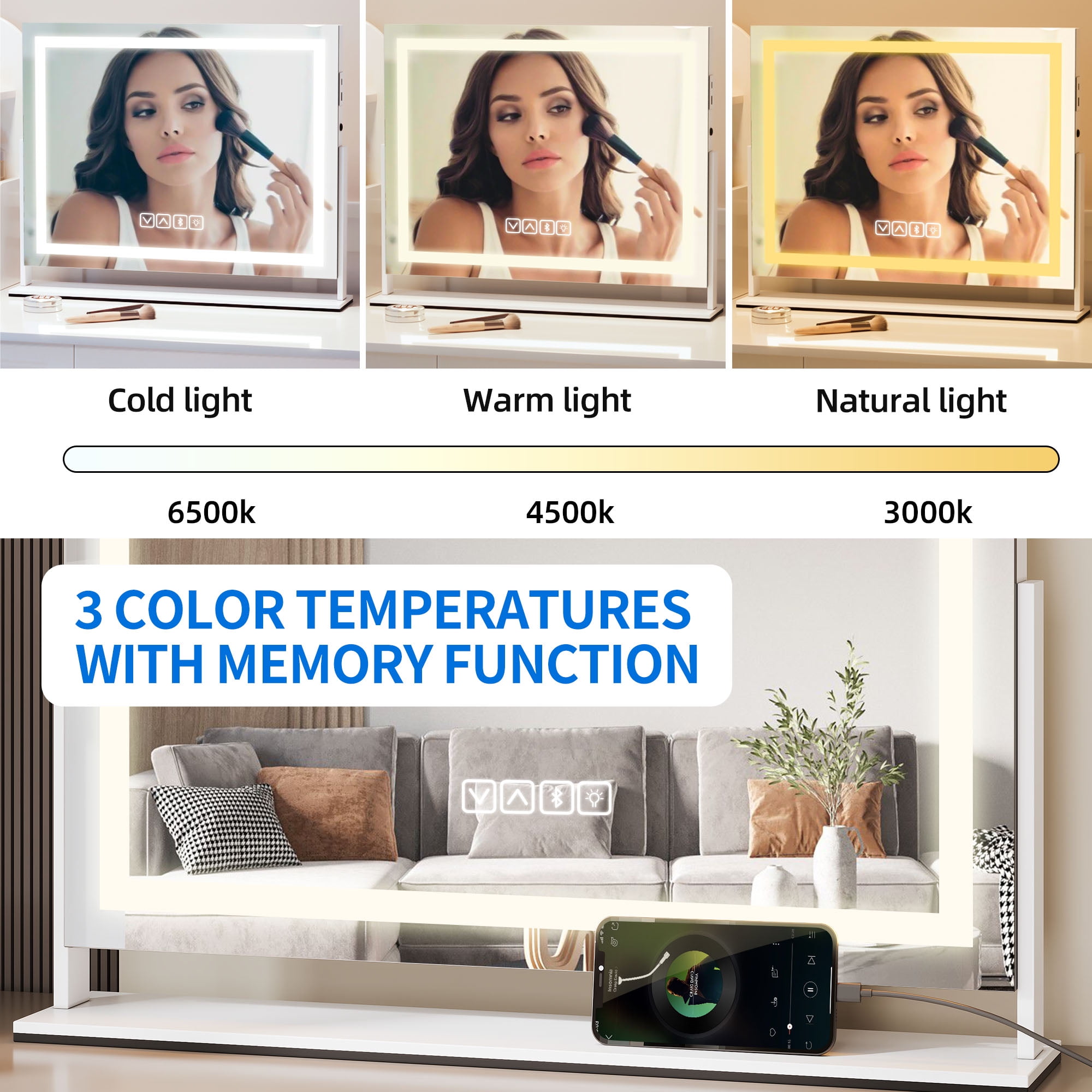 Immersive Audio Experience: Elevate your makeup routine with a built-in Bluetooth speaker in our vanity mirror. Enjoy seamless music connectivity, creating a captivating ambiance that enhances your beauty ritual. Versatile Charging and Storage Options: Experience convenience with our makeup mirror featuring a Type-C USB charging port and a dedicated phone rack. Keep your devices powered up while securing your phone during makeup sessions or live streaming, ensuring a seamless and enjoyable beauty experience. Customizable Lighting Options and Longevity: Illuminate your space with our makeup mirror, boasting a lifespan of over 50,000 hours and high-brightness LED strips reaching a maximum of 6500K. Easily switch between three color lighting modes—white, beige, and yellow—and adjust brightness levels from 0% to 100%, catering to all your makeup needs. Enjoy a Color Rendering Index (CRI) of 95, offering color accuracy akin to natural sunlight. Enhanced Precision and Flexibility: Enhance your makeup application with the 10x magnifying mirror included in our dual-function makeup mirror. Achieve flawless eyeliner, eyebrow, and lipstick application with precision. The mirror’s stable aluminum base, coupled with a 360° rotating feature and convenient wall-mounting hooks, ensures versatility and ease of use. Intuitive Controls and Spacious Design: Seamlessly navigate your lighting preferences with three intelligent touch buttons integrated into our lighted makeup mirror. Benefit from a special memory function that preserves your last used lighting settings. Enjoy a large viewing area provided by the 24.6″ L x 20″ H dimensions of the mirror, styled with a modern and sleek lighting layout for a luminous and natural makeup application experience.