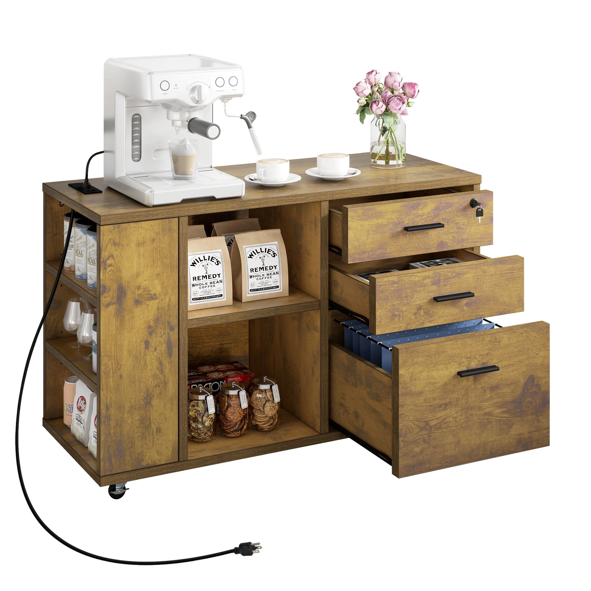 Convenient Charging: With 2 UL-Listed outlets, 2 USB ports, and a 6.5-foot power cord, this wood file cabinet allows you to easily charge multiple devices such as printers, lamps, phones, iPads, and laptops simultaneously while working or studying. Adjustable Storage: The three side storage shelves can be flexibly installed in horizontal or tilted positions, and their height can be adjusted to accommodate items of different sizes, providing versatile storage options for your various essentials. Organized & Secure: The bottom file drawer includes hanging bars for A4, letter, and legal-sized files, ensuring they stay organized and easily accessible. The top drawer is lockable, offering privacy and security for your personal belongings. Mobility & Stability: Equipped with 5 sturdy industrial casters, this office storage cabinet can be effortlessly moved around to suit your needs. Two of the casters have brakes to keep the cabinet in place, while the center wheel provides additional support and stability. Streamlined Organization: Featuring 3 drawers and open storage shelves, this office organization solution allows you to store and access a wide range of office supplies and files, helping you declutter your space and keep everything within easy reach. Filing cabinet Rolling File Cabinet 3-drawer organizer file